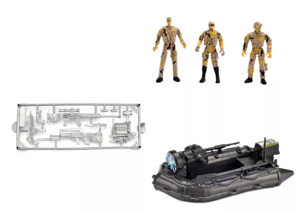 Karinis rinkinys – tai unikalus žaislas, kuris suteiks vaikams įdomių pramogų ir lavins vaizduotę. Rinkinį sudaro tankas, reaktyvinis lėktuvas, pontoninis laivas ir kareivių figūrėlės, leidžiančios kurti tikroviškus karinius scenarijus. Dėl garso ir šviesos efektų pramogos tampa dar patrauklesnės ir kupinos emocijų.