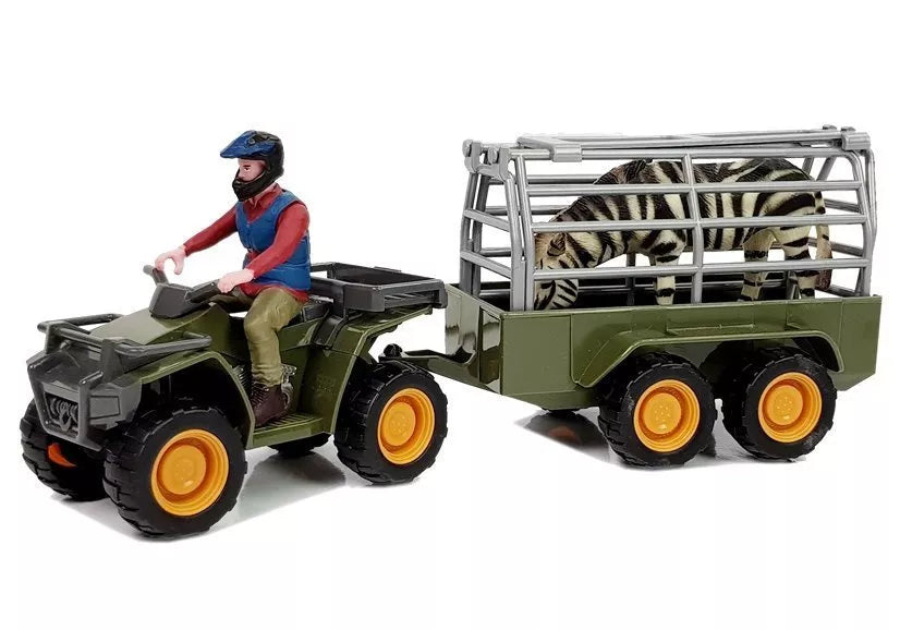 Dabar jūsų vaikas gali keliauti keturračiu su zebra savo kambario erdvėse. Keturratis turi papildomą nuimamą priekabą su atidaromu galu. Tokiu būdu gyvūną galima uždėti ant priekabos. Keturratis su transporteriu yra žalias. Į rinkinį taip pat įeina vairuotojo figūrėlė su šalmu ir zebras.