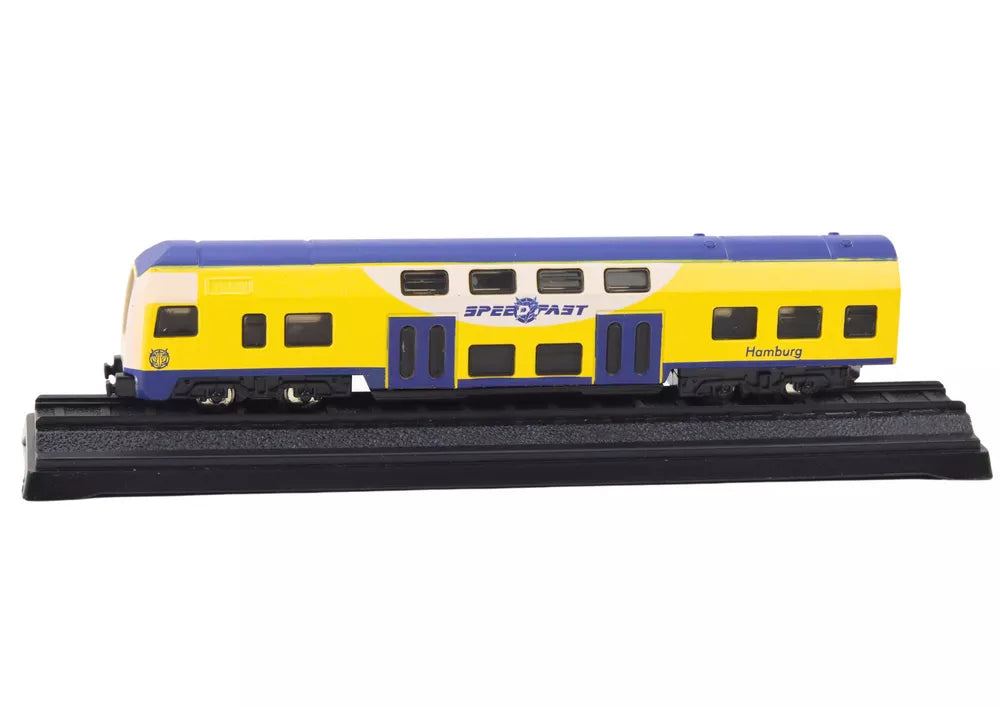 Kolekcinis geltonos ir mėlynos spalvos traukinio modelis 1:48, metalinis