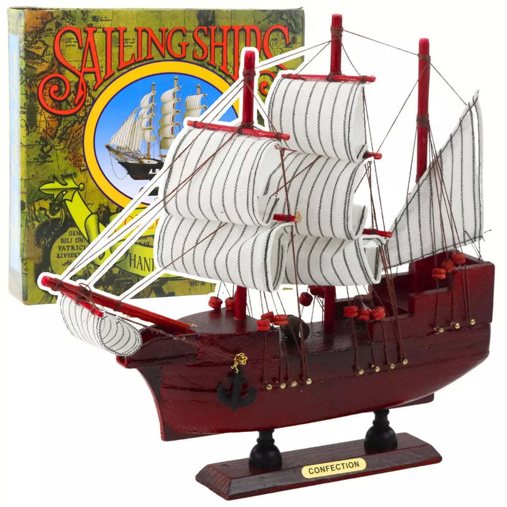 Šis kompaktiškas trijų stiebų burinio laivo modelis yra stilinga klasikinio laivo iš Didžiųjų geografinių atradimų epochos kopija. Korpusas, sodrios Burgundijos spalvos su juodomis ir auksinėmis detalėmis, atkreipia dėmesį ir suteikia laivui elegantišką, dekoratyvinį charakterį. Trijų stiebų struktūra su plonomis dryžuotomis baltomis burėmis sukuria išskirtinį siluetą, primenantį istorinius burlaivius. Kruopščiai suprojektuotas takelažas ir stiebo proporcijos pabrėžia modelio eksponavimo pobūdį ir leidžia jam atrodyti įspūdingai iš visų pusių.