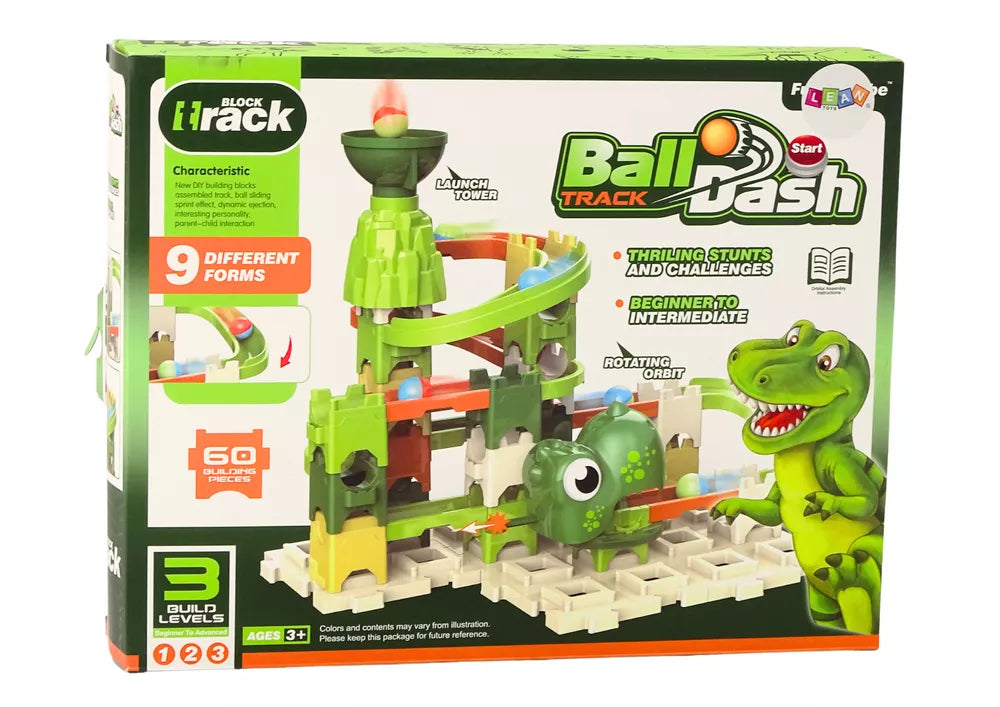 Dinozaurų tema dekoruotos kamuoliukų trasos kaladėlės yra žavus žaislas, kuris sujungia kūrybiškumą su edukacija, suteikdamas vaikams begalines galimybes žaisti ir mokytis. Rinkinį sudaro 60 konstrukcinių elementų, leidžiančių sukurti įvairias kamuoliukų trasas, visos jos yra itin patrauklaus dinozaurų motyvo. Kaladėlės sukurtos taip, kad būtų galima lengvai ir stabiliai konstruoti kamuoliukų trasas. Elementų jungimo procesas reikalauja tikslumo ir koordinacijos, o tai teigiamai veikia smulkiosios motorikos vystymąsi. Vaikai mokosi manipuliuoti kaladėlėmis, kad pasiektų norimą efektą, o tai didina jų kantrybę ir gebėjimą susikaupti.