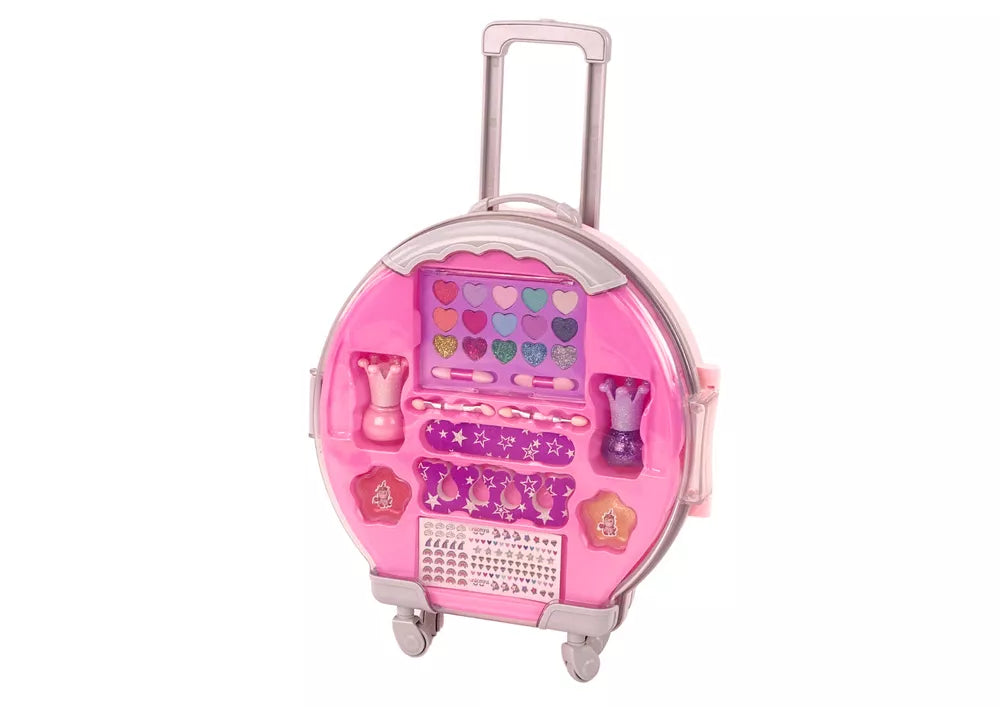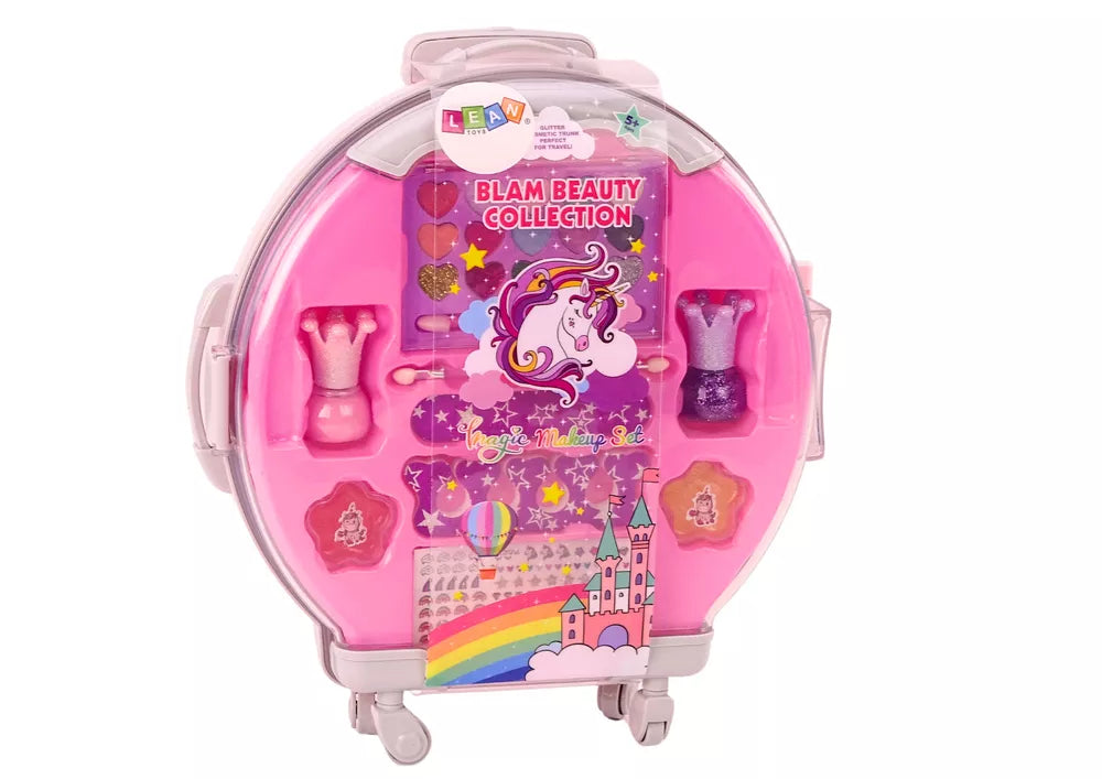 Vaikams skirtas makiažo ir nagų dailės rinkinys supakuotas į žavingą rožinį lagaminą su ratukais ir patogia rankena, todėl atrodo kaip tikras lagaminas, puikiai tinkantis kelionėms.