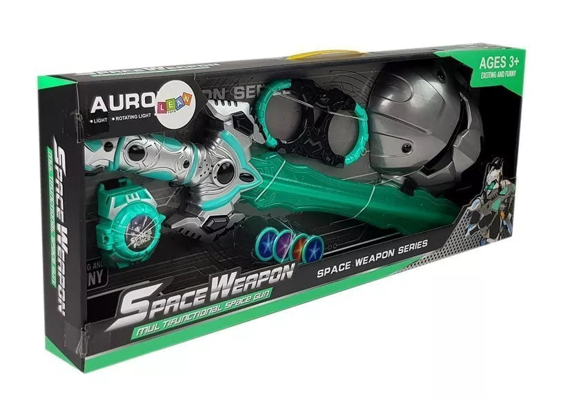 Kardas skleidžia garso ir šviesos efektus, kaip ir tikroje kovoje kosmose. Verta išbandyti tamsoje. Be to, rinkinyje yra kaukė, kurią užsidėjęs mažylis atrodys kaip karys kosmose. Visas rinkinys yra juodos, sidabrinės ir turkio spalvų. Diskų paleidiklis ir rankų pančiai leis sugauti priešininką. Paleidiklį galima užsidėti ant rankos, įdėti į jį diskus ir šaudyti į priešą.