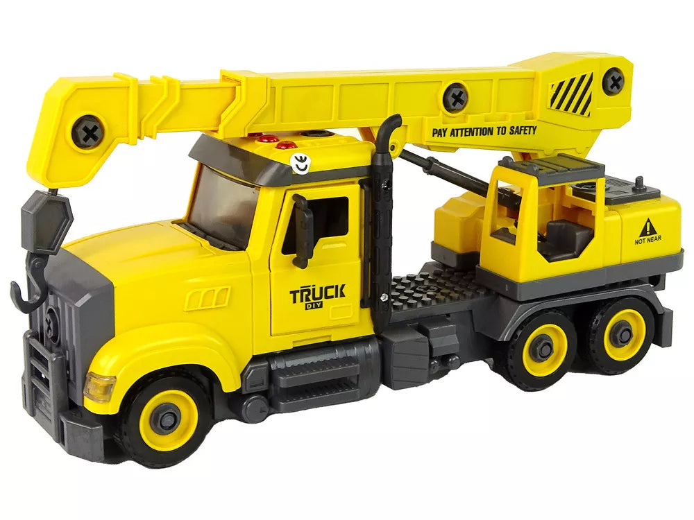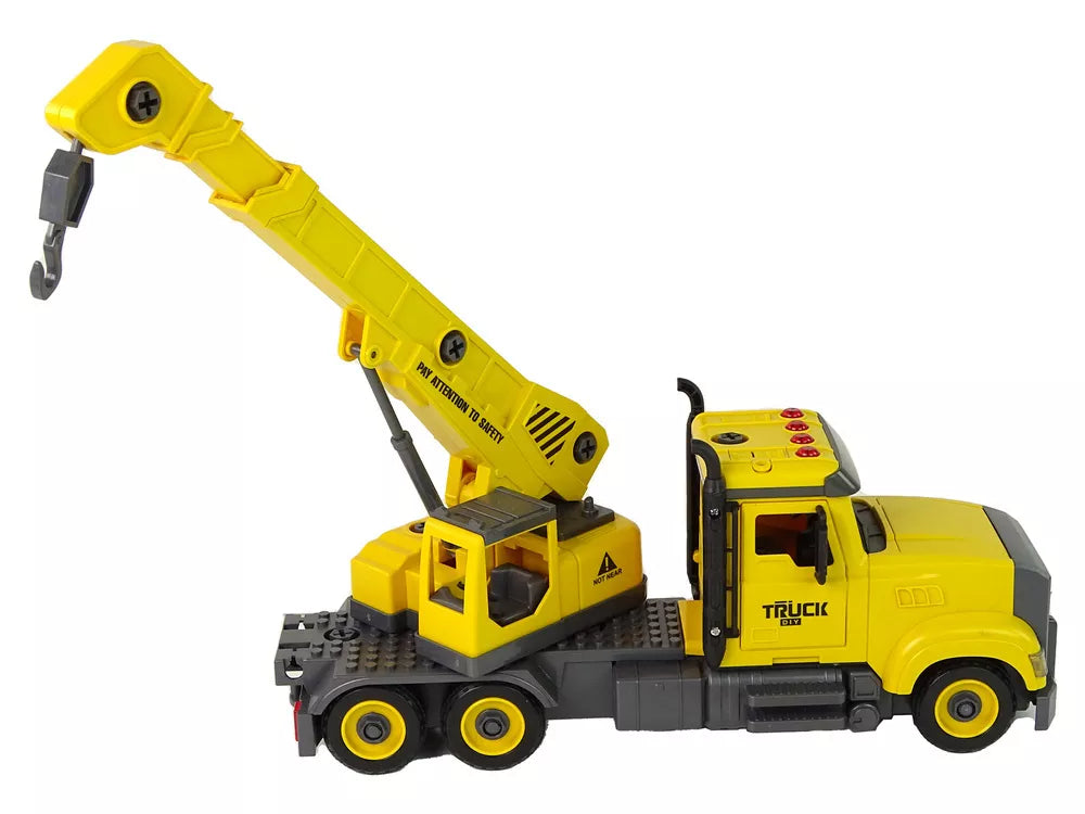 Rinkinį sudaro geltonas sunkvežimis su kranu, kurio matmenys 33 cm x 16 cm x 9,5 cm. Jis turi 4 mygtukus, kurie įjungia 4 skirtingus garsus, suteikdami pramogai autentiškumo. Judantys elementai, tokie kaip durelės ir judantis kranas, padidina patrauklumą ir skatina tyrinėjimą.