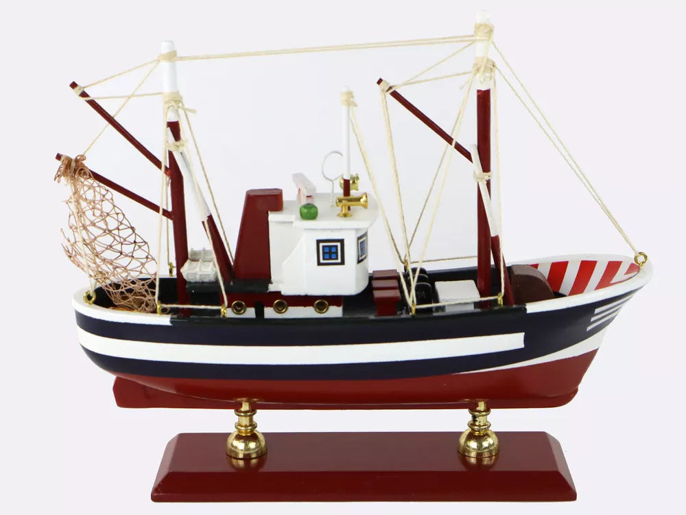 Šis kolekcinis laivo modelis yra unikalus rankų darbo kūrinys. Jis pastatytas ant tvirtų medinių kojelių, suteikiančių jam elegancijos ir rafinuotumo. Laivas yra tamsiai mėlynos spalvos su raudonomis ir baltomis juostelėmis, suteikiančiomis jam klasikinę jūrinę išvaizdą.