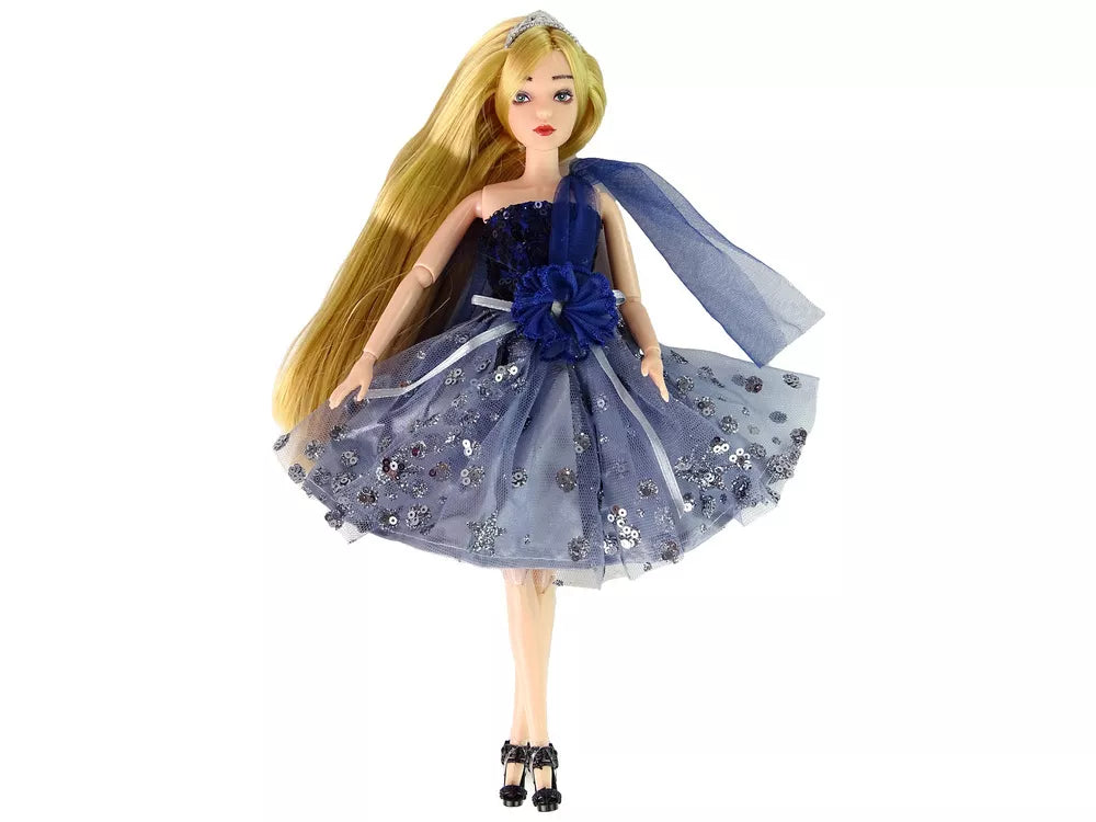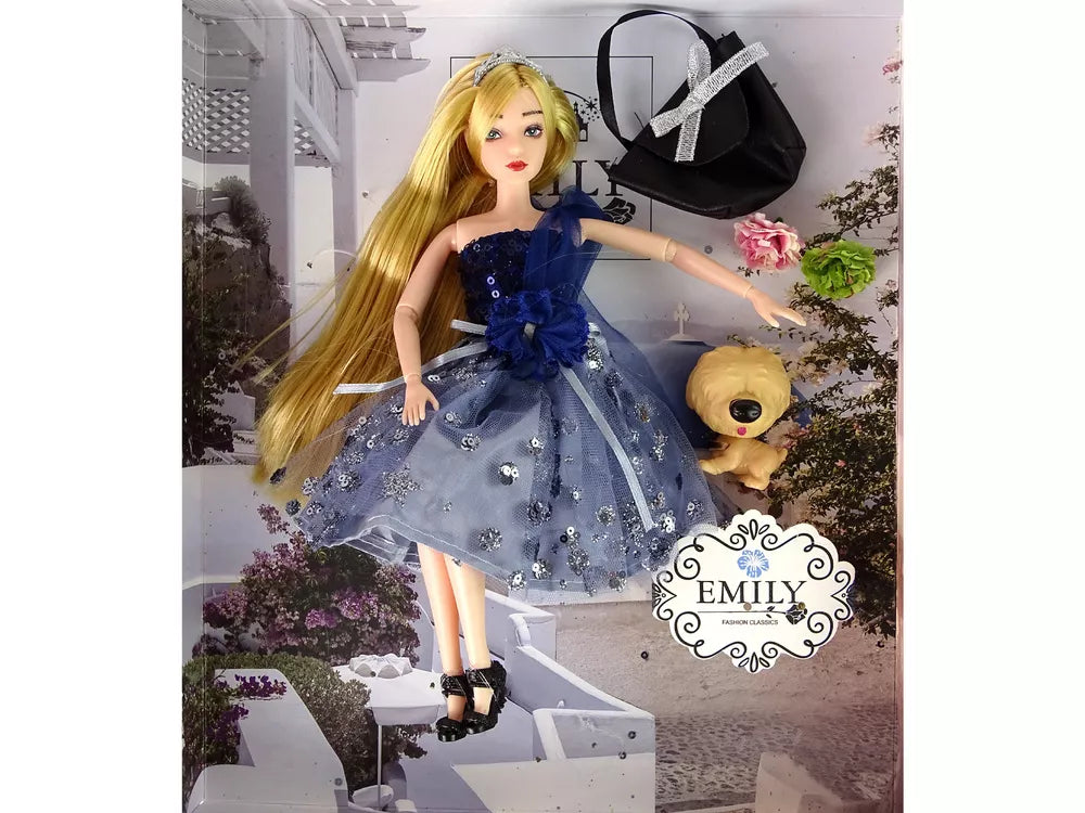 Pristatome žavingąją Emily lėlę su nuostabia tamsiai mėlyna suknele, papuošta žėrinčiomis blizgučiais ir elegantišku kaspinėliu. Jos ilgi šviesūs plaukai yra gražiai papuošti tiara, suteikiančia jai nepakartojamo žavesio. Ant kojų Emily avi stilingus juodus aukštakulnius, papuoštus subtilia rože.