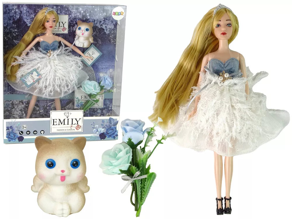 Pristatome žavingąją Emily lėlę su ilgais šviesiais plaukais, apsirengusią elegantiška suknele, dekoruota blizgučiais ir į plunksnas panašia medžiaga. Jos plaukus puošia tiara, o žydros akys suteikia žavesio. Emily avi gražius juodus batelius su aukštakulniais, dekoruotus rože.