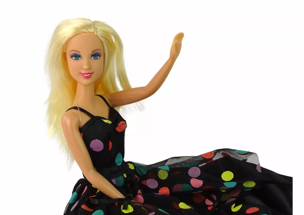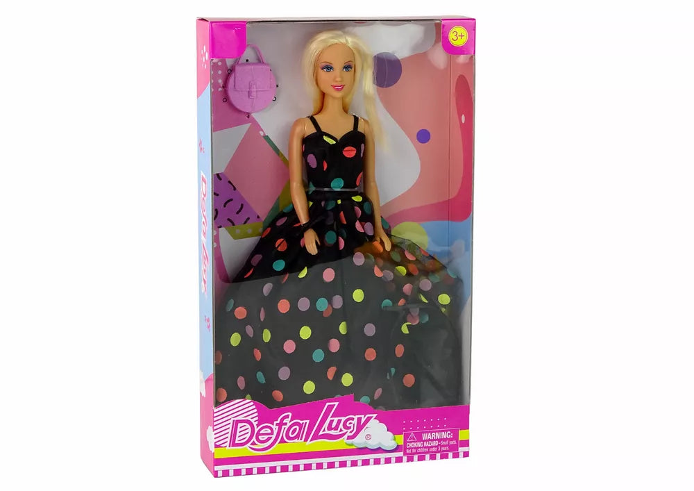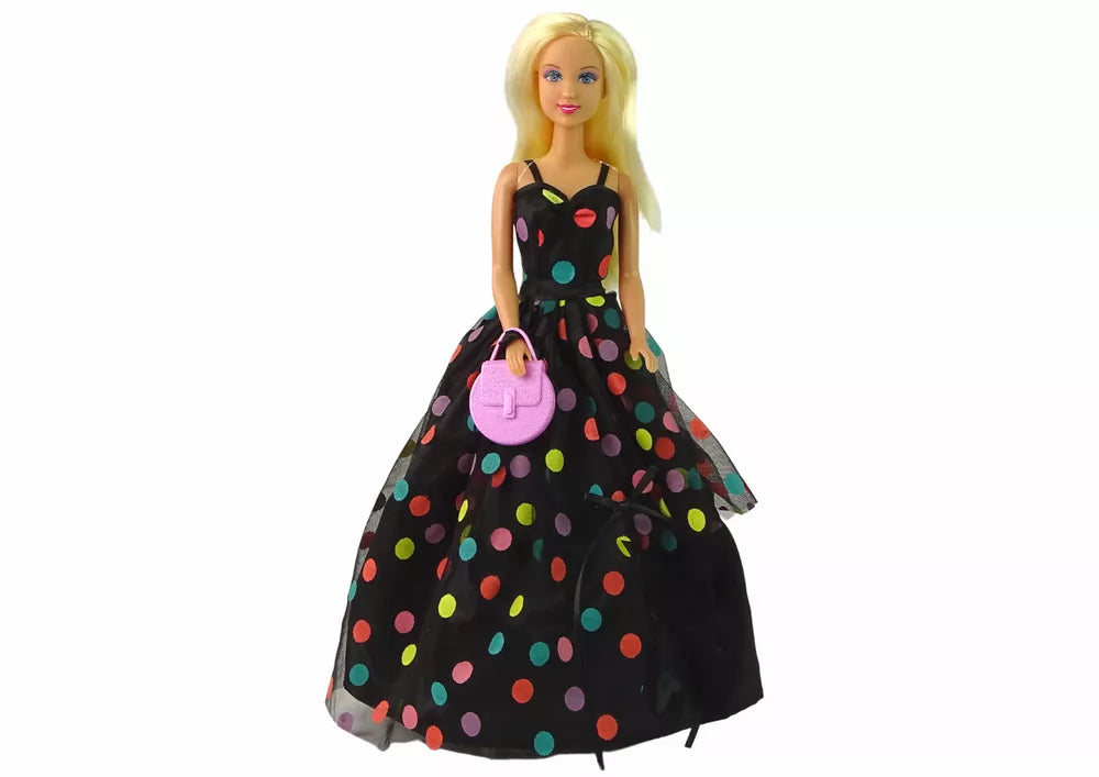 Lėlė apsirengusi ilga suknele, kuri yra juoda su spalvotais taškeliais. Šie taškeliai suteikia suknelei linksmumo ir smagumo. Suknelė yra laisva ir krenta laisvai, suteikdama lėlei elegantišką išvaizdą.