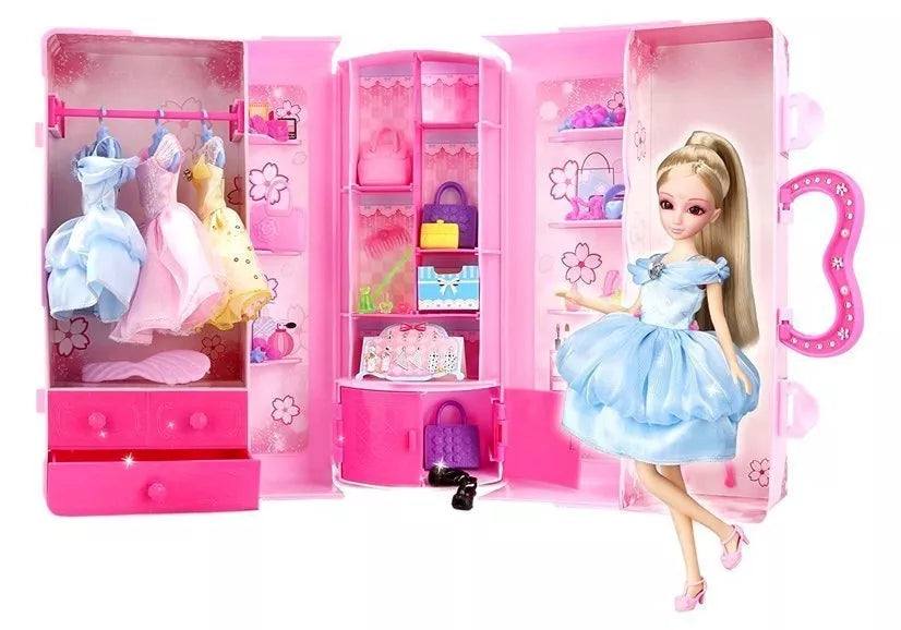 Lėlė, modelis. Drabužių rinkinys. Persirengimas. Papuošalai lagamine