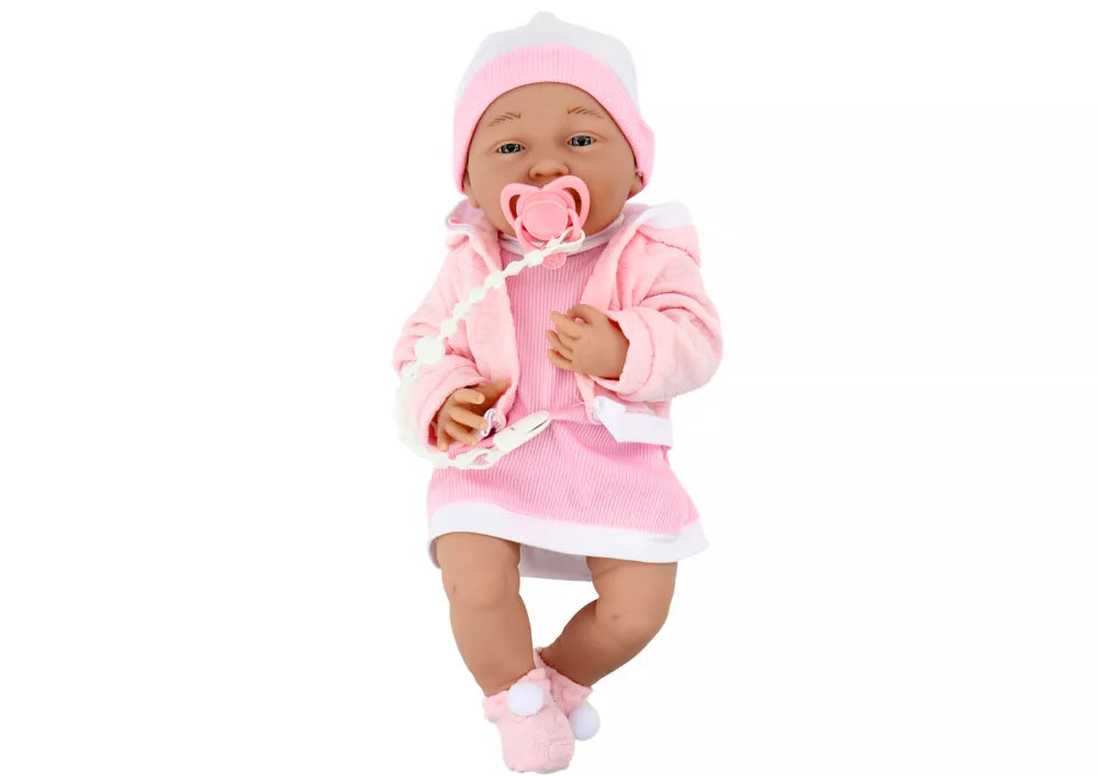 Lėlė kūdikis su čiulptuku, rožine suknele, kepure ir priedais, 35 cm