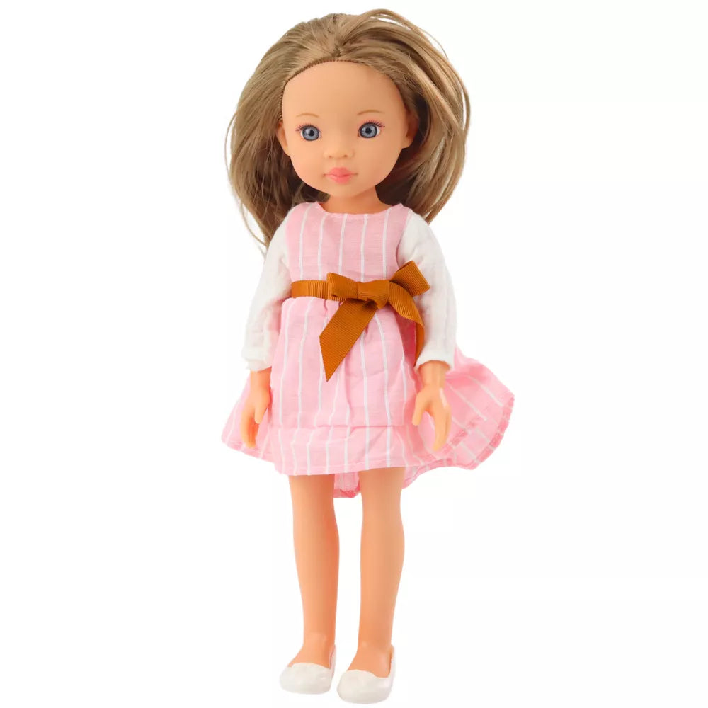 Lėlė vilki rožinę suknelę su baltais dryžiais, ilgomis baltomis rankovėmis ir dekoratyviniu rudu kaspinėliu ties juosmeniu, kuris suteikia jai elegancijos ir mergaitiško žavesio. Įvaizdį papildo klasikiniai balti bateliai. Drabužį galima nuimti, todėl lėlė tinka žaisti persirengimus ir kurti savo mados kūrinius.