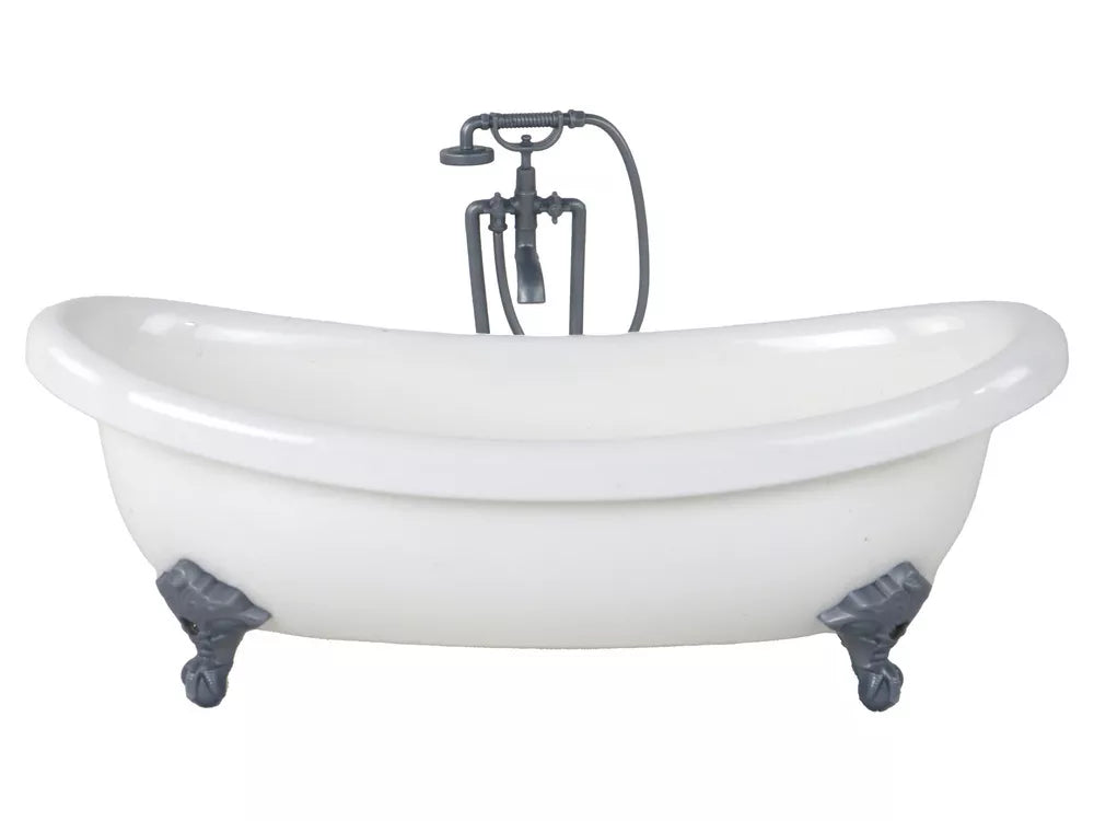 Vaikiška lėlė ilgais šviesiais plaukais, mėlynas chalatas, vonia, vonios kambarys