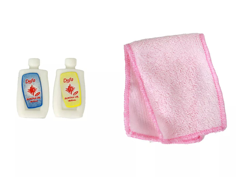Rinkinyje yra priedai, leidžiantys visapusiškai pasirūpinti lėle. Rožinis rankšluostis, mėlynas šepetys plaukams, 2 įdegio aliejai, džinsiniai šortai, trumpomis rankovėmis palaidinė, balta vonia, kurios matmenys 23 cm x 10 cm x 13 cm.