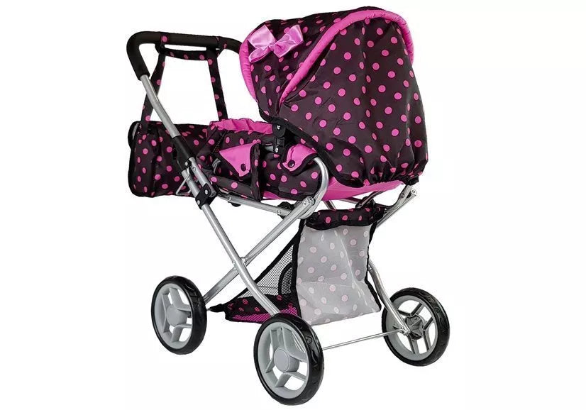 Vežimėlis yra prislopintos spalvos, kuri neatitraukia vaiko dėmesio. Vežimėlio medžiaga yra juoda su rožine. Ant krašto šono yra gražus rožinis kaspinas. Vežimėlis turi daug daugiau privalumų. Lėlę galima vežti ne tik gulint, bet ir gondolą galima sulankstyti ant vežimėlio, kad lėlė neiškristų, yra papildomi pilki dirželiai. Taip pat galima sulankstyti stogelį. Būtiniausius lėlės priedus galima laikyti pridedamame krepšyje. Be to, į komplektą įeina nešioklė kūdikiui, o vežimėlio apačioje yra krepšelis būtiniausiems daiktams.