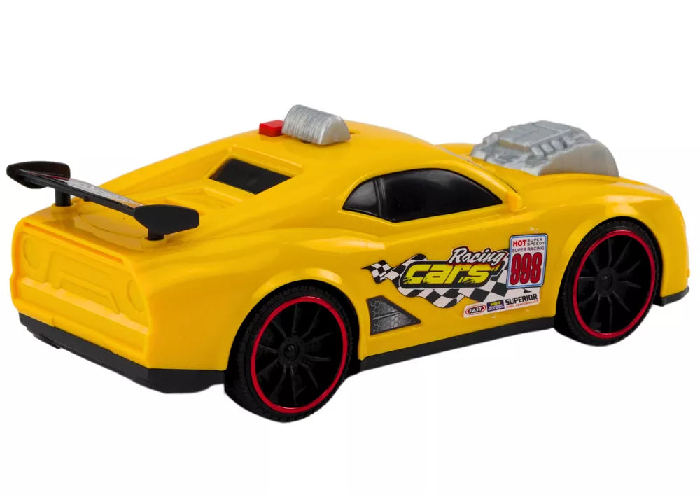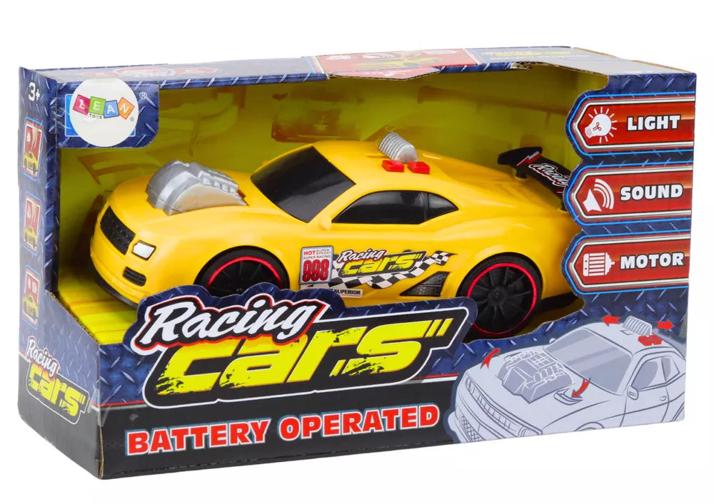 Lenktyninis automobilis su šviesomis ir garsais, atidaromas variklis, geltonas