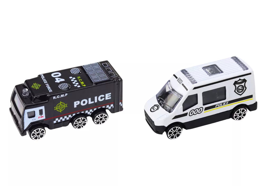 Į rinkinį įeina du detalūs policijos automobiliai, kurie puikiai tinka trasai.