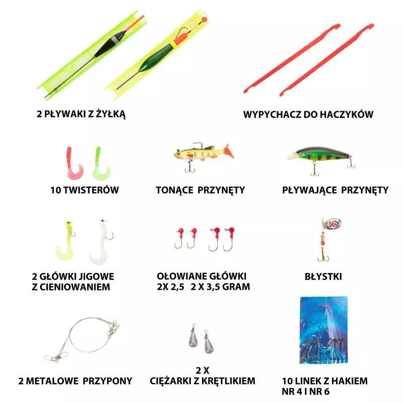 Aksesuarų dėžutėje yra: plūdės, suktukai, kabliukai, svareliai, masalai su kabliukais, tvisteriai