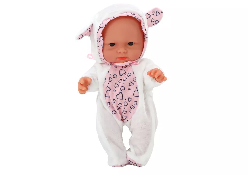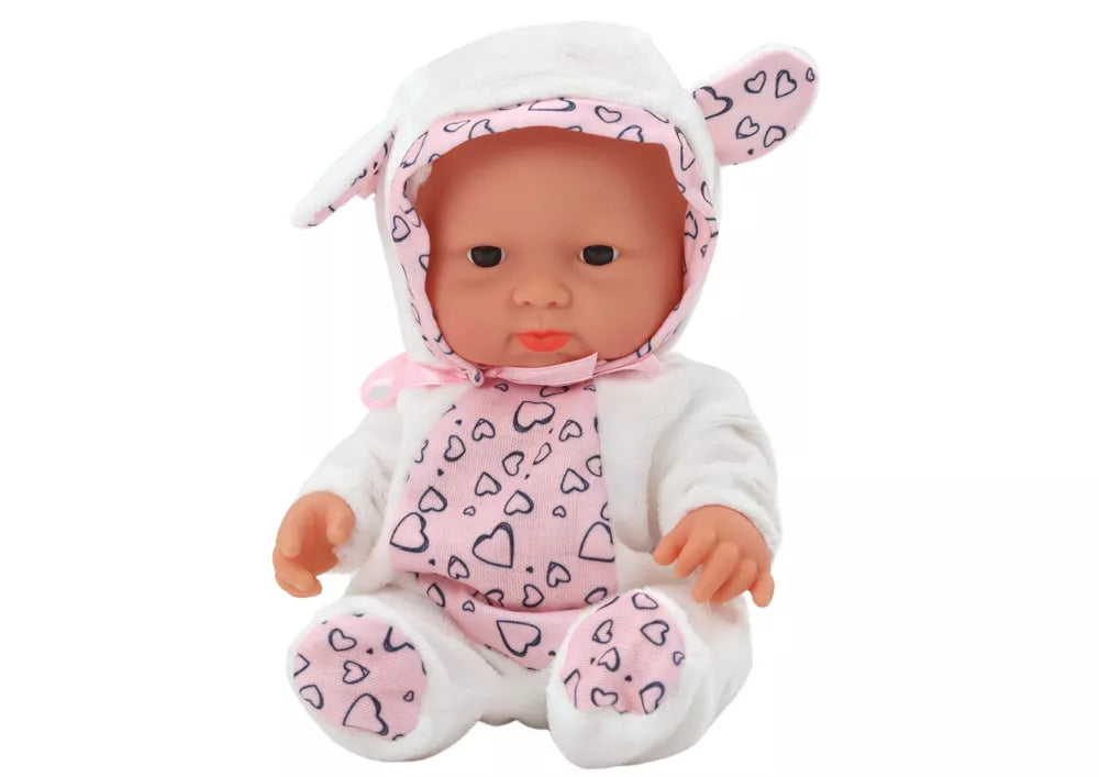 Žavinga maža lėlytė! Ši maža lėlytė, kurios matmenys 21 cm x 14 cm, yra puiki palydovė kiekvienai mažai mergaitei. Ji apsirengusi žavingu baltu drabužėliu, papuoštu širdelėmis, kurios daro ją žavingą ir mielą.