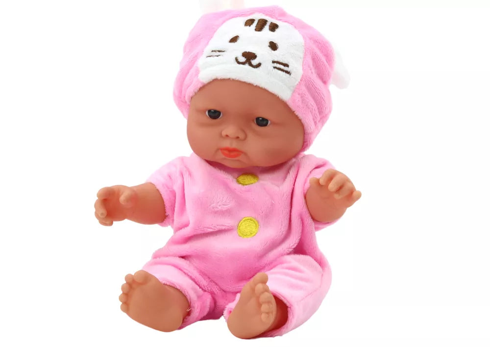 Mažylė lėlytė, rožiniai drabužėliai, zuikučio kepurė
