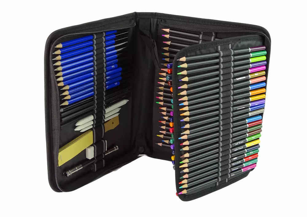 - Kreidelės ir pieštukai: rinkinyje yra 72 kreidelės ir 12 skirtingo kietumo pieštukų, leidžiančių tiksliai piešti ir šešėliuoti.