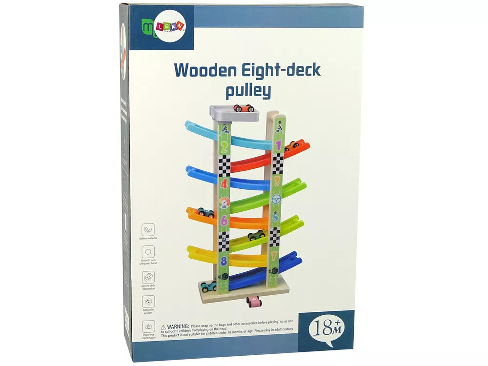 Nusileidimo takelis yra spalvingas ir turi 8 aukštus, kiekvienas sunumeruotas. Iš karto keli automobiliai ir lenktynės! Jūsų mažylis išmoks, kaip automobiliai juda nuožulniais paviršiais.