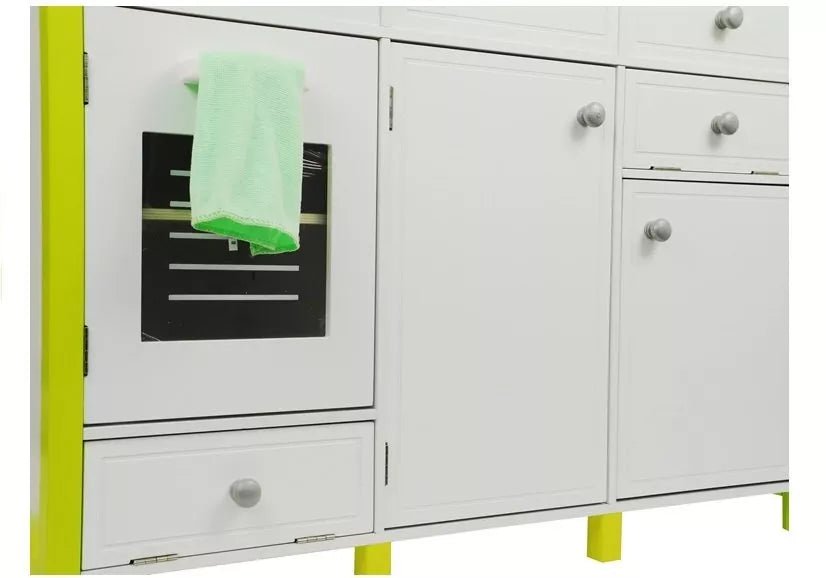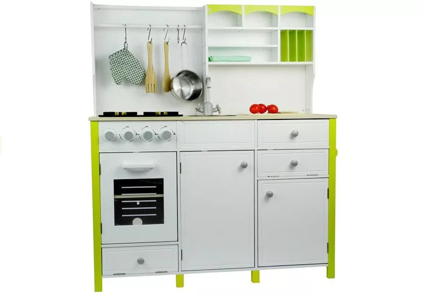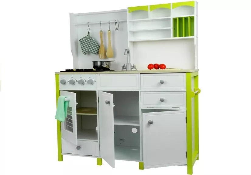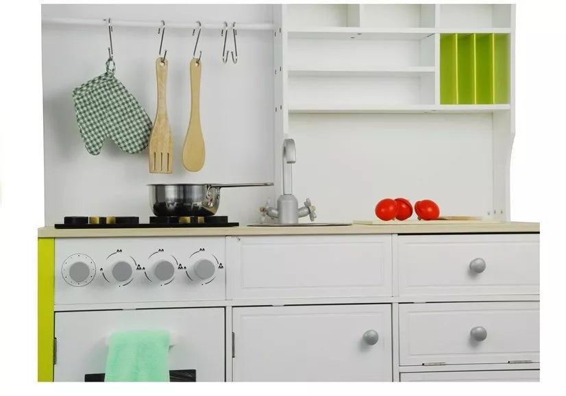 Medinė virtuvėlė vaikams žalia ir balta Paula su atidaromais elementais