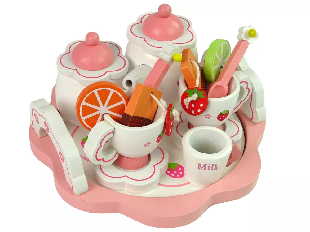 Rinkinys pagamintas gražiomis baltos ir rožinės spalvų tonais su gėlių ir braškių motyvais. Du puodeliai leis pakviesti geriausią vaiko draugą pažaisti ir šiek tiek pasišnekučiuoti.