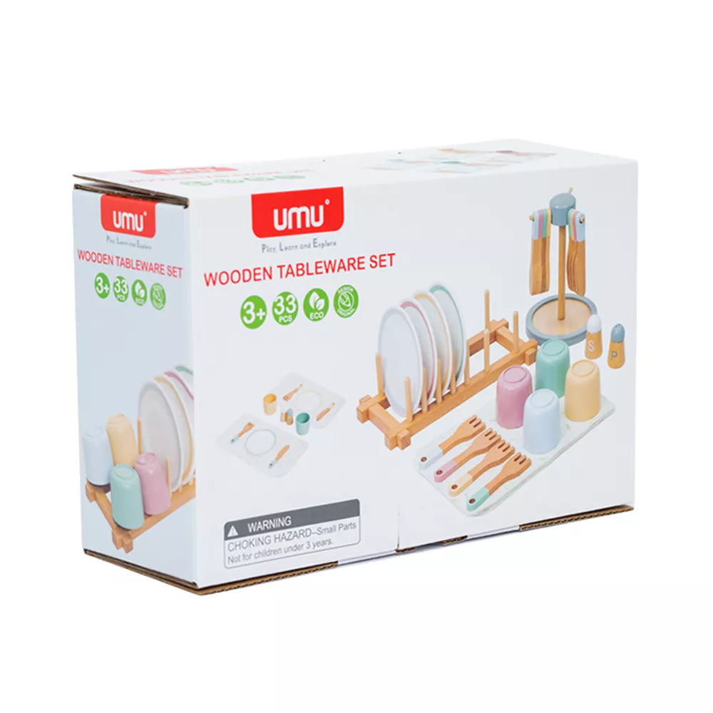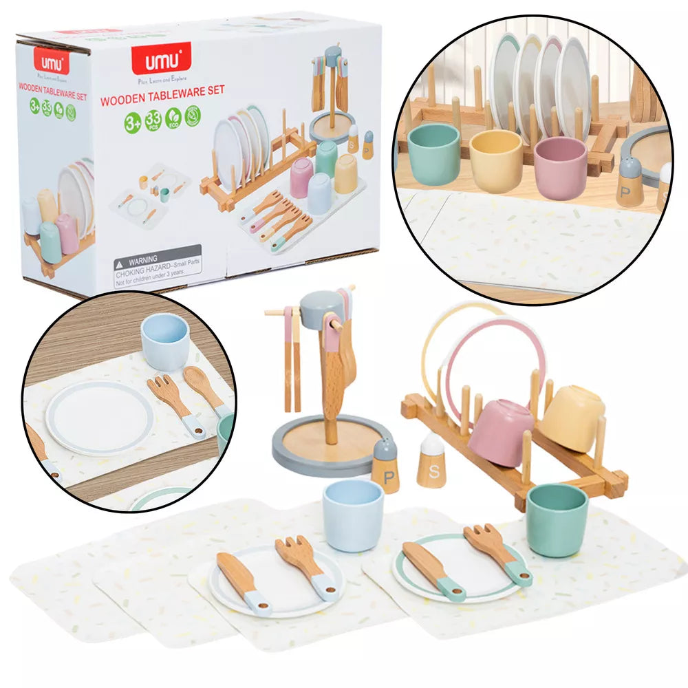 Medinis žaidiminių indų rinkinys yra puiki idėja vaikams, kurie mėgsta mėgdžioti suaugusiuosius ir žaisti namus, restoraną ar arbatėlę su draugais. Rinkinyje yra net 33 realistiškai atkartoti elementai, tokie kaip lėkštės, dubenėliai, puodeliai, šaukštai, šakutės, servetėlės, prieskonių lentynos ir indų džiovykla, kurie leidžia vaikams kūrybiškai žaisti ir tobulėti per vaidmenų žaidimus.
