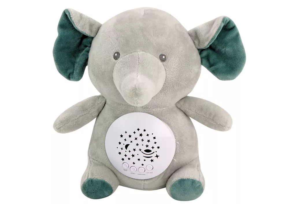 Meškiukas drambliukas, migdantis melodijas, šviesos žvaigždžių projektorius, pilkas