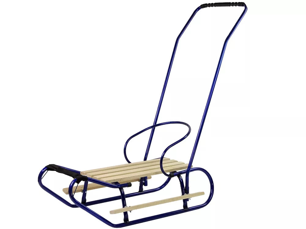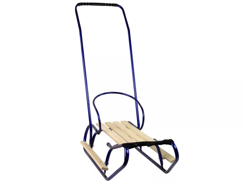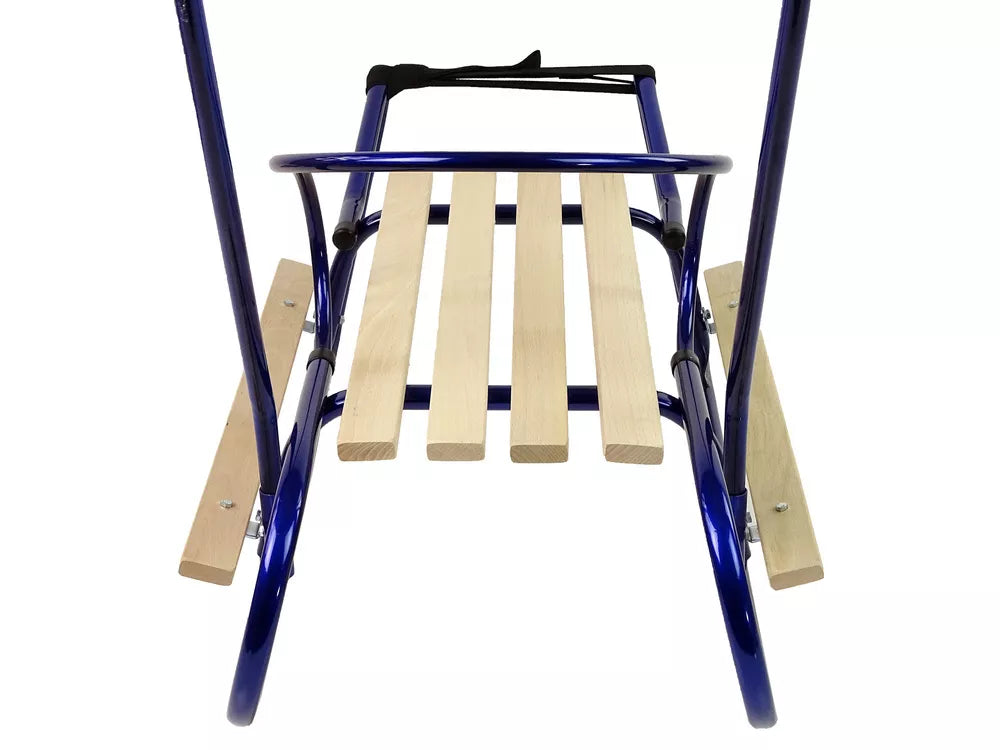 Metalinės rogutės su stūmimo rankena, atlošu ir dirželiu, mėlynos