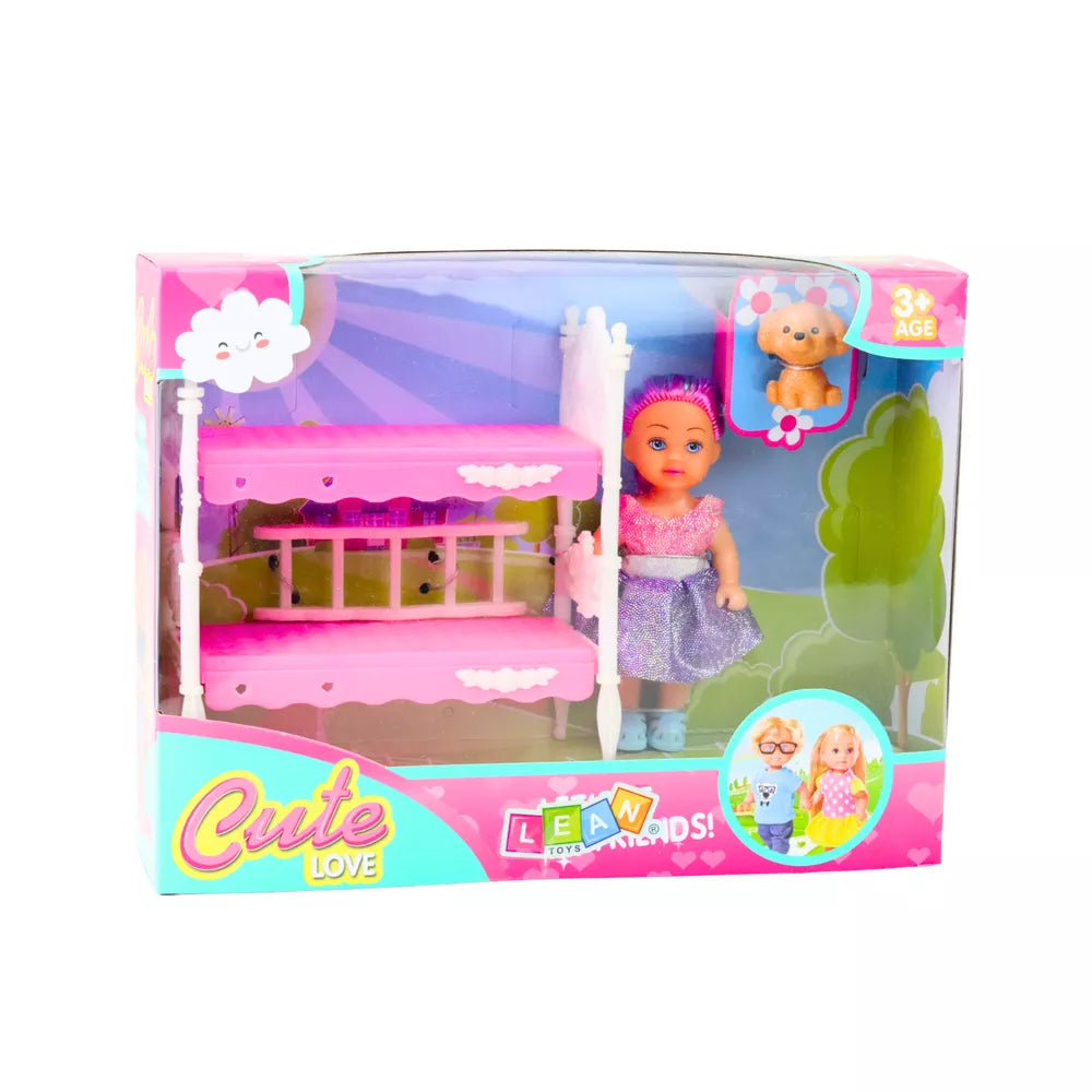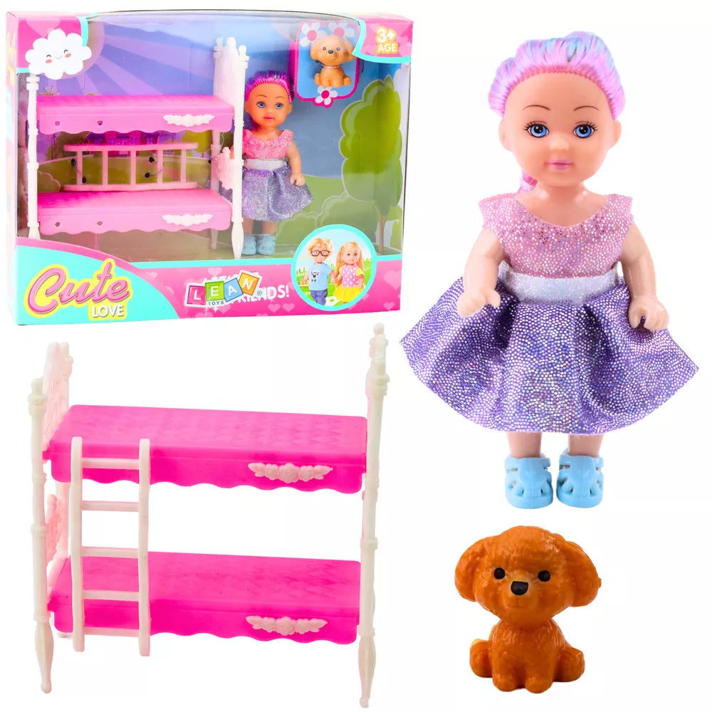 Lėlė su dviaukšte lova ir šunimi yra žavingas žaidimų rinkinys, lavinantis vaizduotę ir suteikiantis vaikams daug galimybių kūrybinei veiklai. Rinkinį sudaro 12 cm ūgio lėlė, apsirengusi blizgančia, spalvinga suknele, mielas šuniukas ir funkcionali dviaukštė lova su kopėčiomis – puikiai tinka žaisti namus, rūpintis augintiniu ir kurti scenas iš kasdienio gyvenimo.