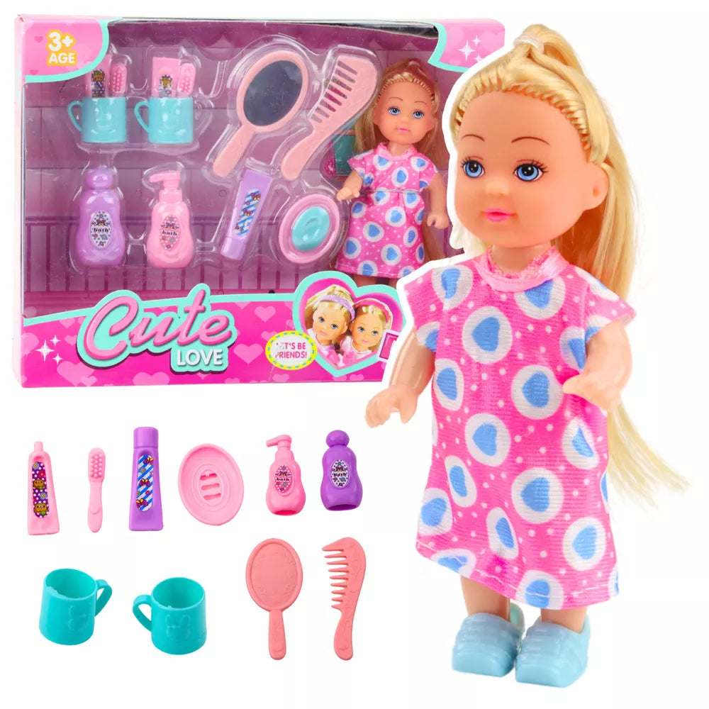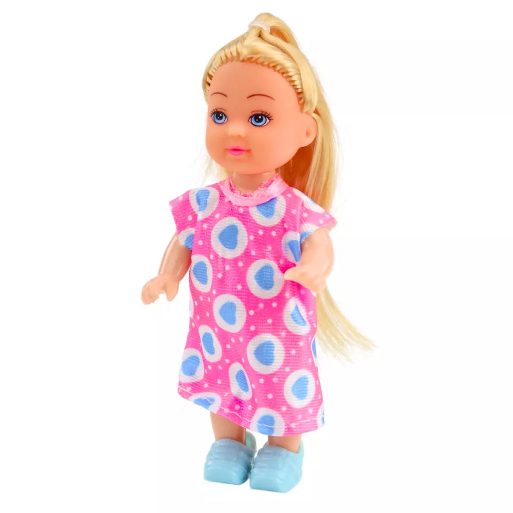 Mini lėlių rinkinys, priežiūros reikmenys, rožinė suknelė