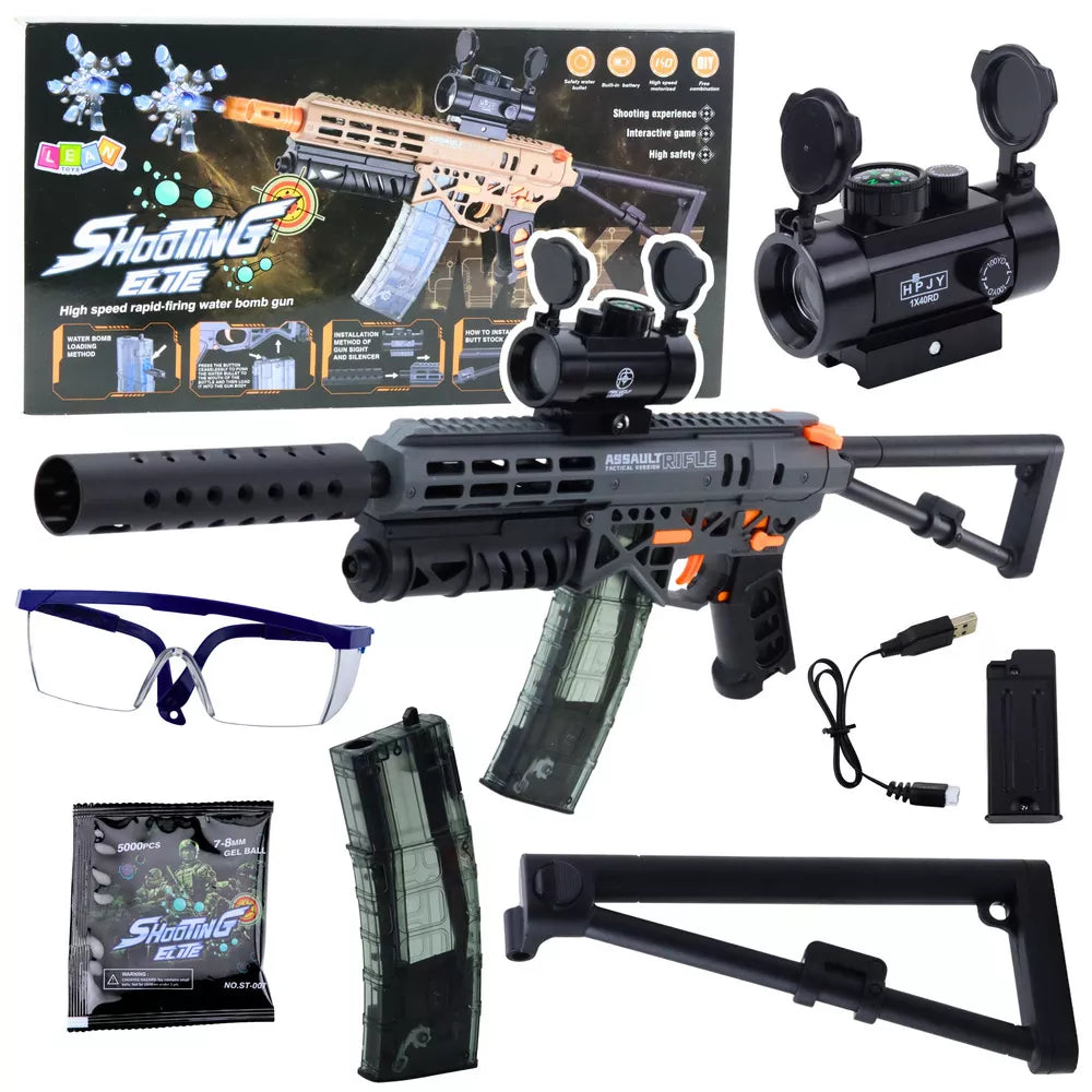 Rinkinį sudaro daugybė priedų, kurie žaidimą daro dar įdomesnį – du keičiami dėtuvės, teleskopinis taikiklis, sulankstoma buožė ir apsauginiai akiniai. Šie priedai suteiks jūsų vaikui ar paaugliui jausmą, kad jis yra tikroje treniruočių aikštelėje ir visiškai pasineria į varžybų jaudulį. Pridedamas vandens PELYČIŲ pakelis, sušlapęs tampa minkšta, saugia amunicija, idealiai tinkančia intensyvioms kovoms.