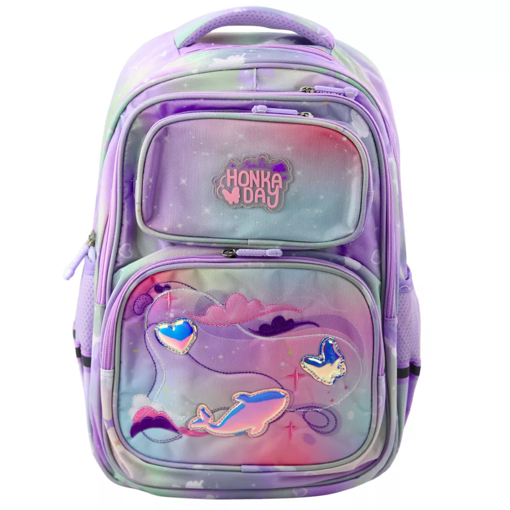 Spalvinga mokyklinė kuprinė pasteliniais mėlynos, violetinės ir rožinės spalvos atspalviais – tai pasiūlymas vaikams, kurie vertina ne tik funkcionalumą, bet ir stilingą bei linksmą išvaizdą. Kuprinė išsiskiria žėrinčiais delfinų ir širdelių formos paveikslėliais, kurie suteikia jai unikalumo.