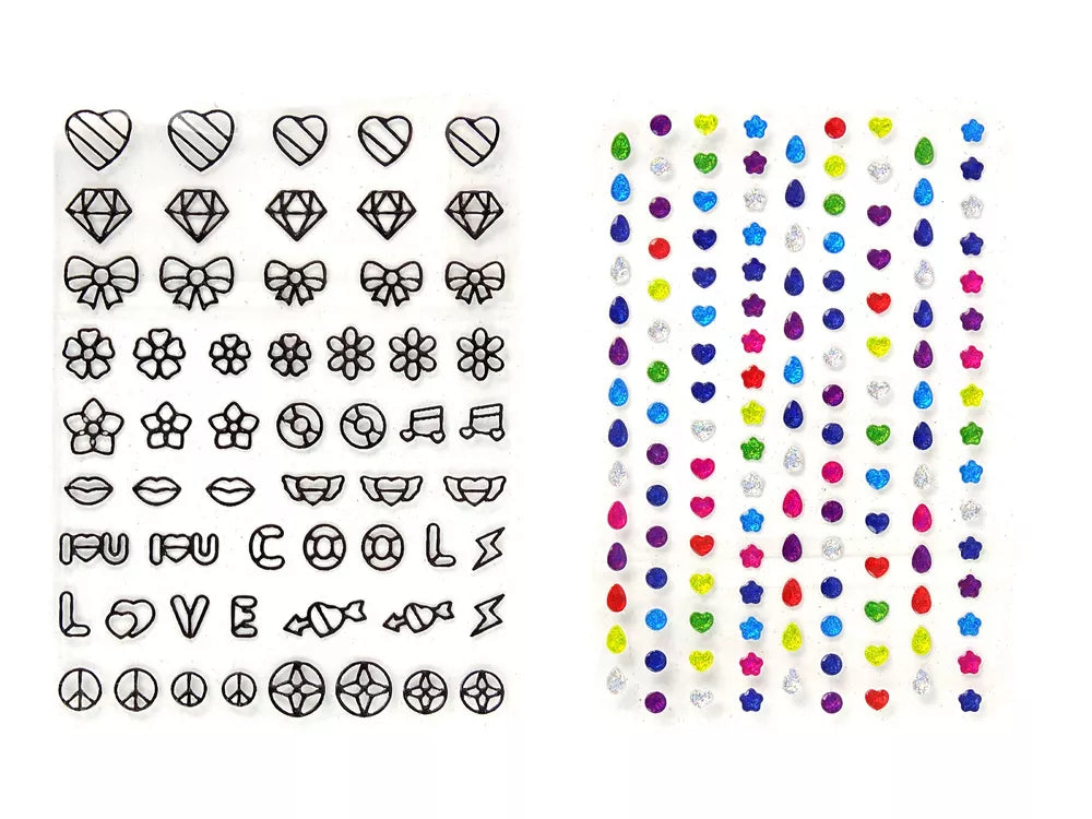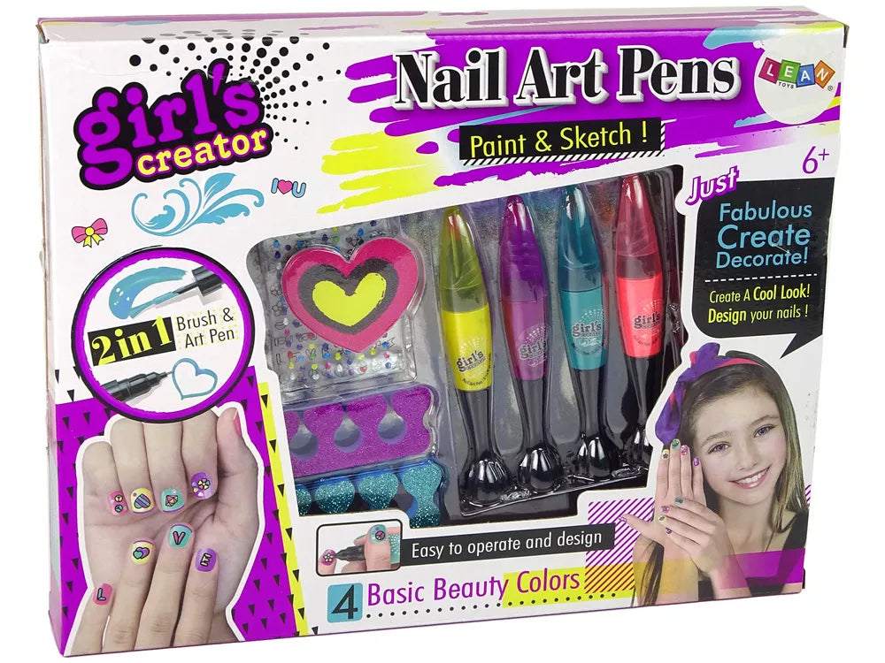 Sulyginus nagų ilgį ir formą širdelės formos dilde, tepkite pasirinktą spalvą ant nagų. Rašikliai leis tiksliai nupiešti dizainą, jie yra dviejų spalvų. Piešdama dizainus, mergaitė lavina tikslumą ir kuria savo stilių. Lipdukai suteiks originalumo ir spindesio.