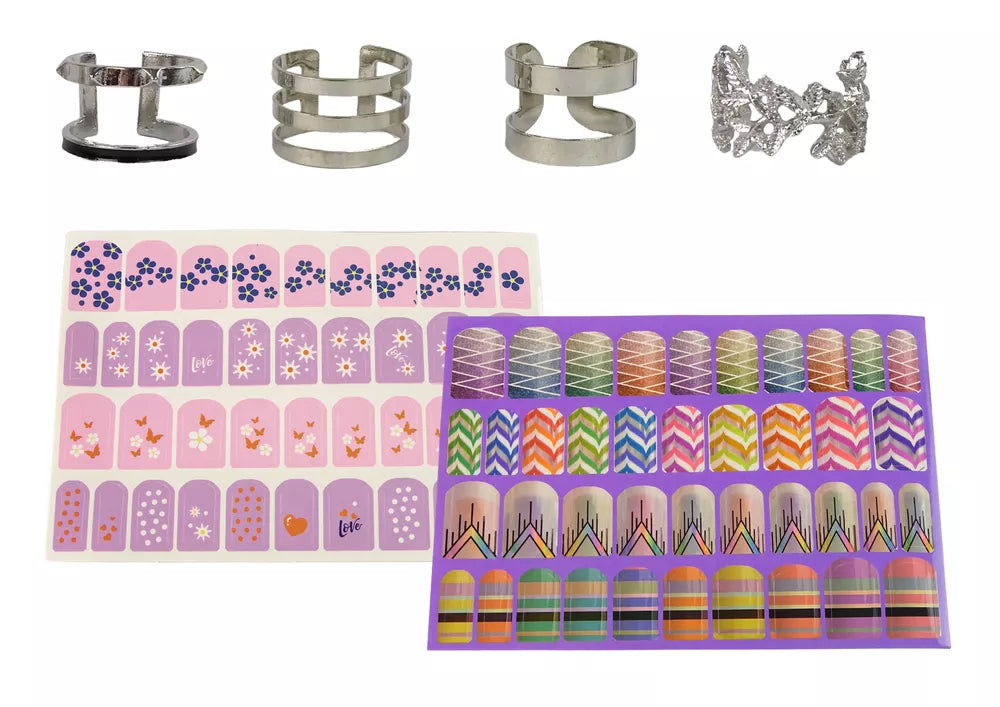 Daugiaspalvis nagų lakų rinkinys ir įvairūs spalvingi lipdukai. Klasikiniai, raštuoti ir blizgūs lipdukai leis susikurti gražų manikiūrą, kurį galima greitai ir neinvaziškai pašalinti įprastu nagų lako valikliu.
