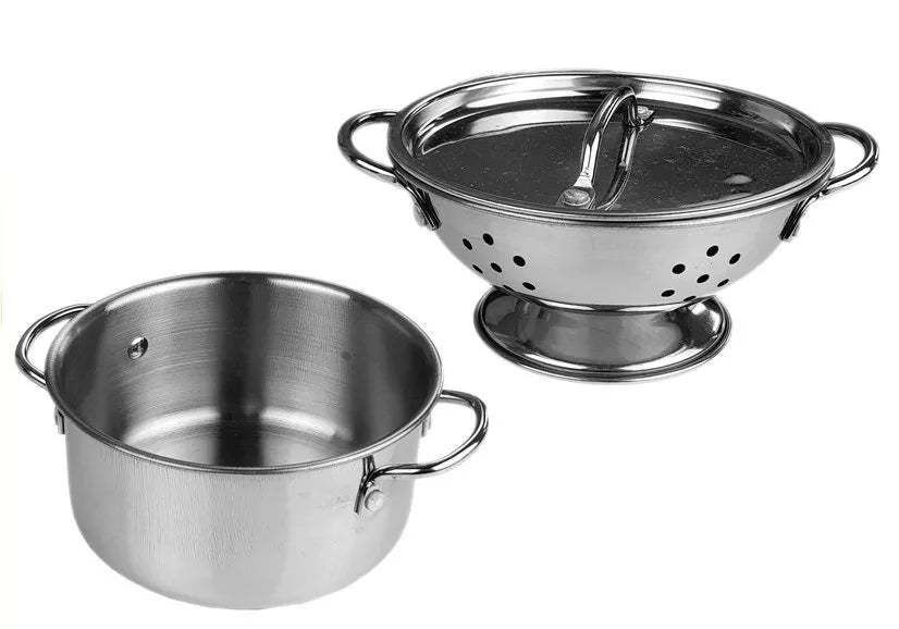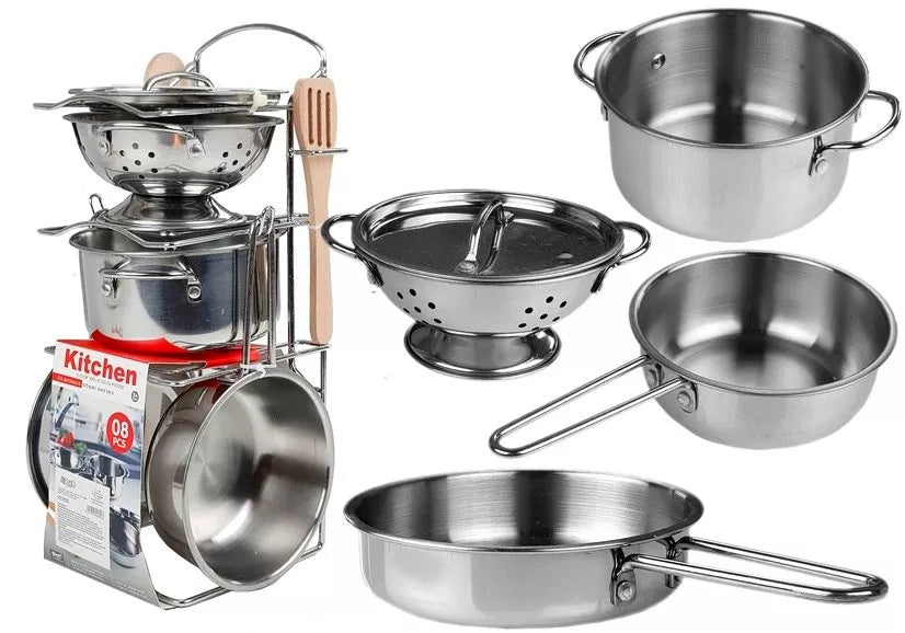 Mūsų pristatytą rinkinį sudaro blizgantys, metaliniai, sidabriniai stalo reikmenys, į kuriuos įeina, be kita ko, puodas, keptuvės ar kiaurasamtis. Elementų gausa leidžia smagiai praleisti laiką, kurio metu mažieji gali apsimesti, kad gamina skanius patiekalus, o taip pat patiekti juos savo tėvams, meškiukams ir lėlėms.
