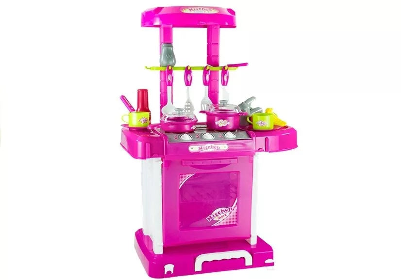 Kas apibūdina šį rinkinį? Linksma, gyva spalva, taip pat dizainas, kuris tiksliai atspindi tikrąją objektų išvaizdą. Viryklė įrengta su dviem apšviestais žiedais ir kiekvienas iš jų turi savo jungiklio raktą. Kai mažas virėjas jį įjungs, virėjas skleis garsą, primenantį tikrą patiekalų gaminimą. Papildoma atrakcija yra orkaitės laikmatis, kuris įjungus skleidžia tradicinį laikrodžio atgalinį skaičiavimą. Praskaičiavus laiką, virėjas automatiškai išsijungs. Šios novatoriškos funkcijos leis vaikui nuostabiai pasilinksminti, kurios metu jis galės labai saugiai imituoti tėvus.