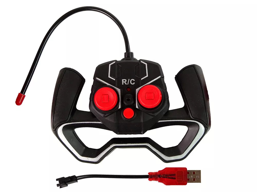 Juodas nuotolinio valdymo pultas su raudonais mygtukais yra lengvas, patogus ir idealiai tinka mažoms rankutėms. Jo matmenys: 13 cm x 9 cm x 3 cm. Automobilio matmenys yra 20 cm x 13 cm x 9 cm. Rinkinį sudaro automobilis, nuotolinio valdymo pultas ir įkroviklis su USB 2.0 įvestimi akumuliatoriui įkrauti.