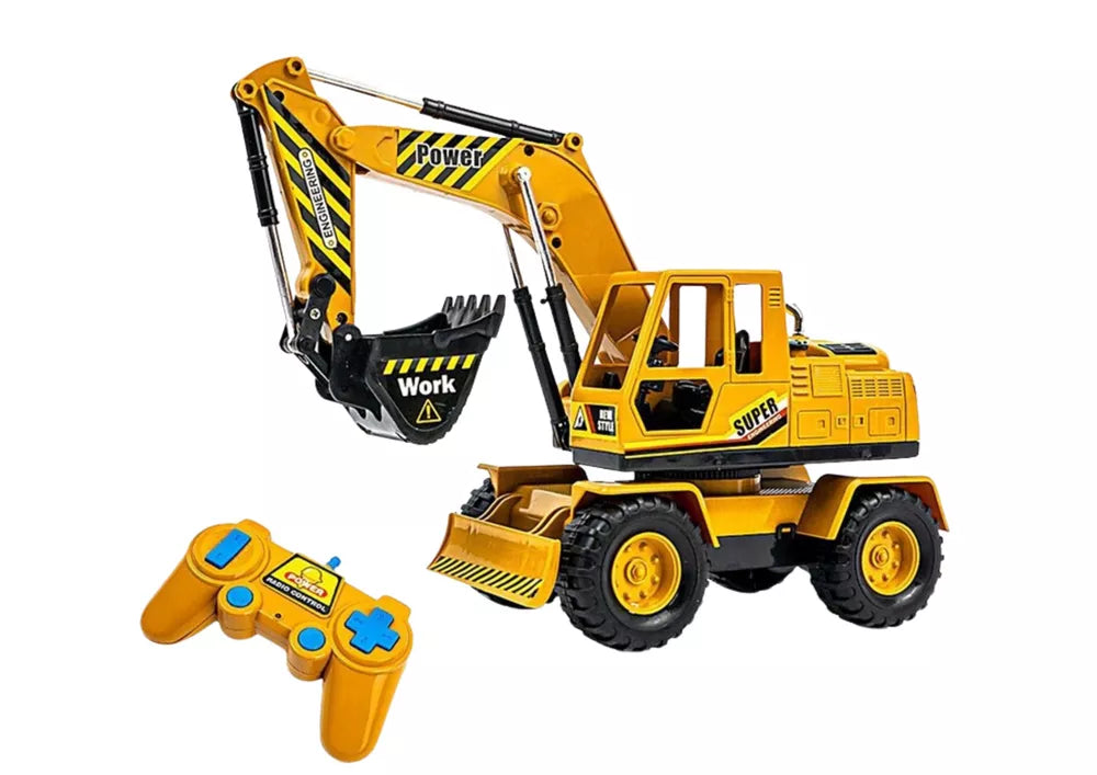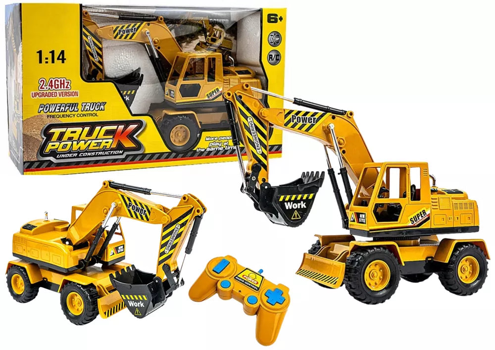 Nuotoliniu būdu valdomas ekskavatorius su priekiniu buldozeriu masteliu 1:14 yra puikus žaislas kiekvienam mažam statybinės technikos operatoriui. Dėl tvirtos konstrukcijos, realistiškos išvaizdos ir funkcijų, primenančių tikras statybines transporto priemones, vaikas gali pasijusti kaip tikroje statybvietėje.