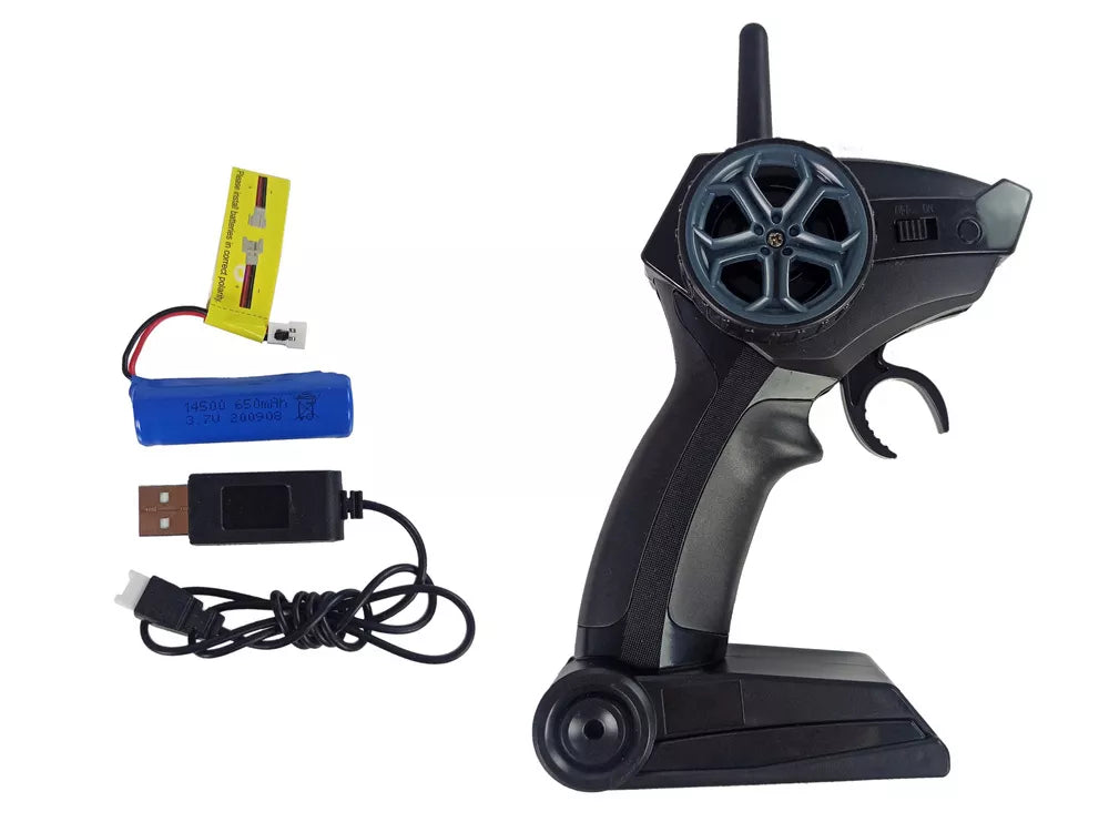 Kateris turi 3.7V/ 650 mAh baterijas, o nuotolinio valdymo pultas turi 2 AA 1.5V baterijas. Katerio baterijas reikia įdėti po deniu – skylė sumaniai paslėpta už skydelio, kur yra vairuotojas ir keleivis. Tinka vaikams nuo 14 metų.