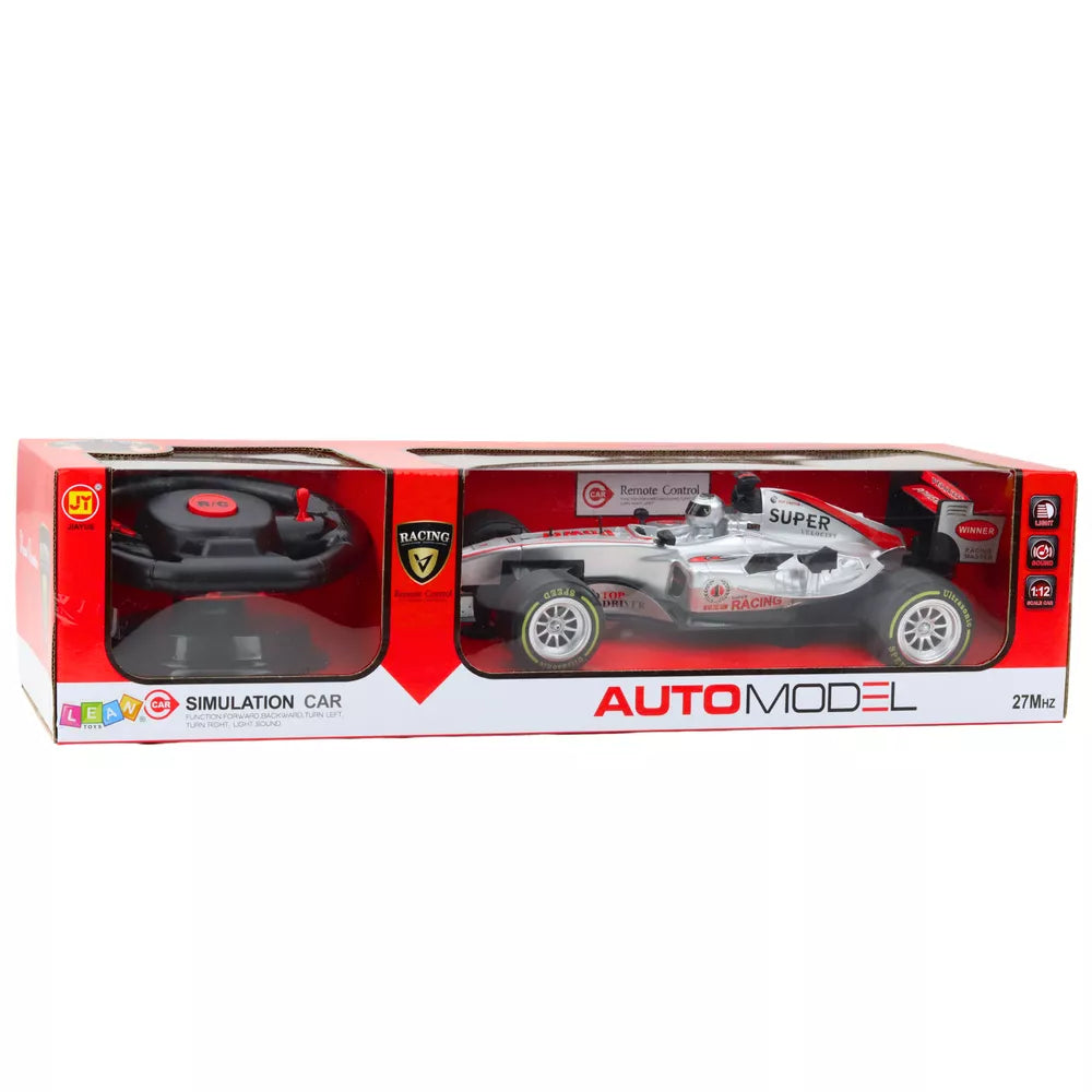 Nuotoliniu būdu valdomas RC lenktyninis automobilis su vairu, šviesomis ir garsais, 1:12, sidabrinis