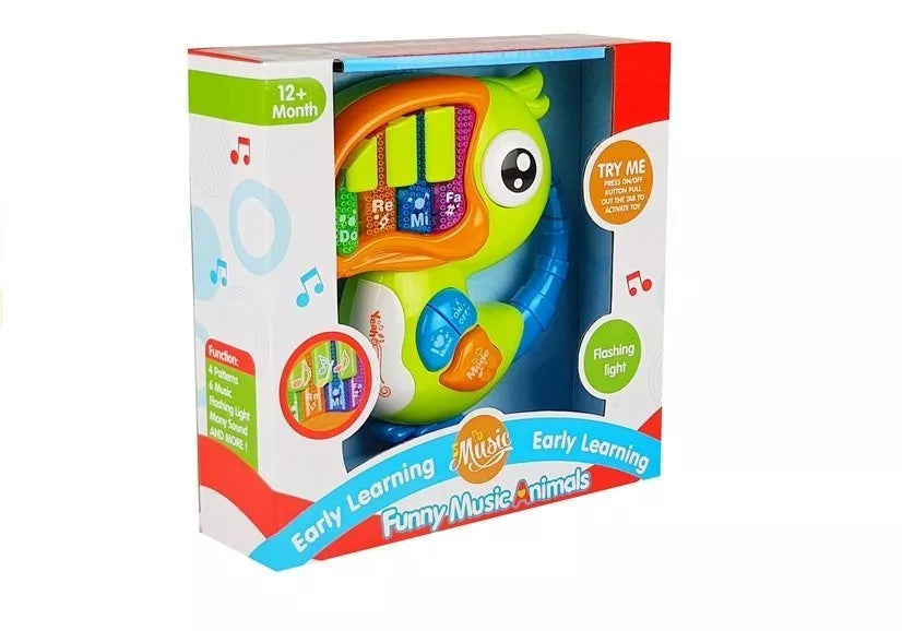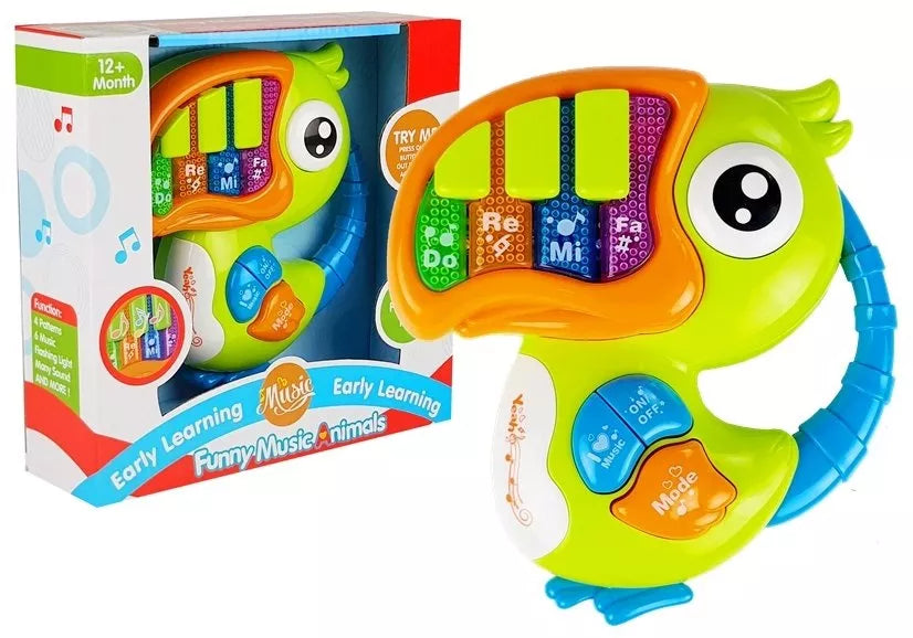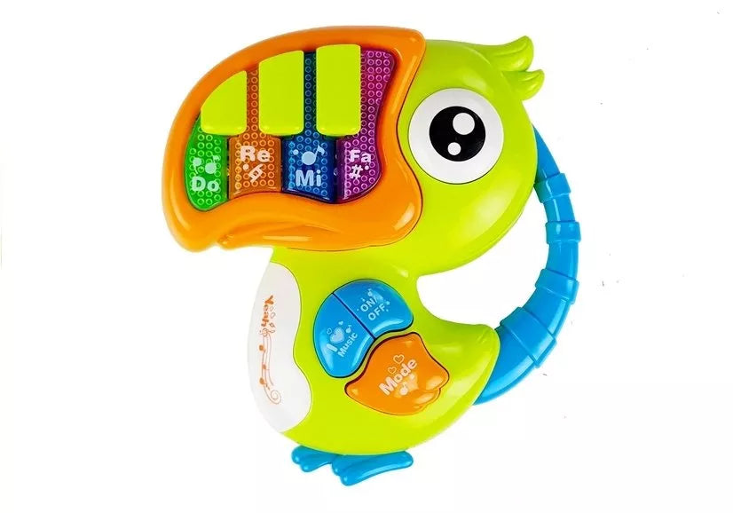Žaislą sudaro labai spalvinga ir linksma konstrukcija. Spalvingos papūgos formos pianinas pradžiugins kiekvieną mažylį. Jame yra muzikiniai mygtukai, o linksmybes lydi šviečiančios mygtukų „DO“, „RE“, „MI“ lemputės. Žaislas paleidžiamas ON / OFF mygtuku. Šalia jo yra mygtukas „MODE“, kuris keičia pianino garsų režimus. Paspaudę klavišus, galime klausytis linksmų melodijų, gyvūnų garsų arba standartinių pianino garsų grodami savo melodiją.