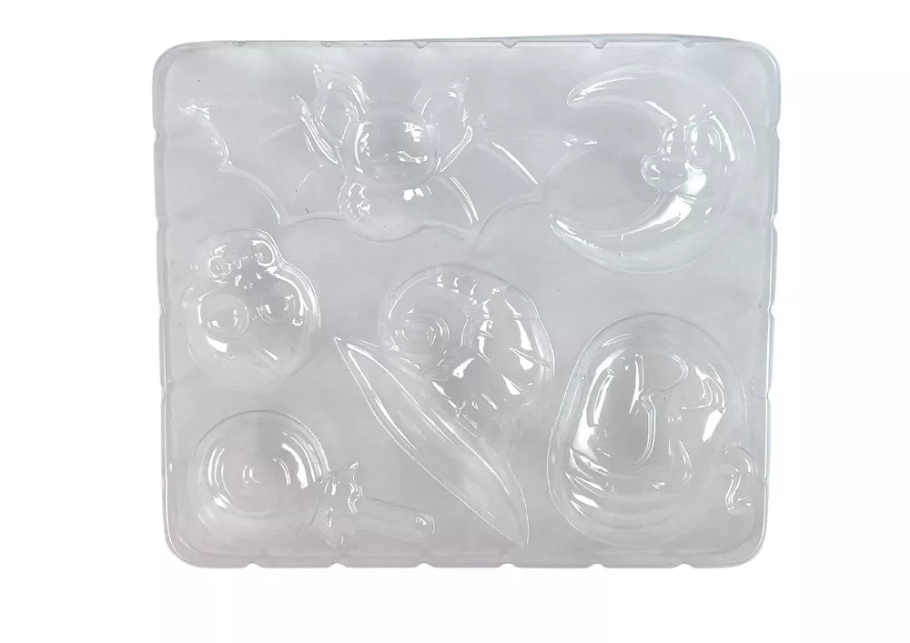 - forma su kaukolės, moliūgo, mėnulio, šikšnosparnio, saldainių čiulpinuko ir didelės skrybėlės formos formomis