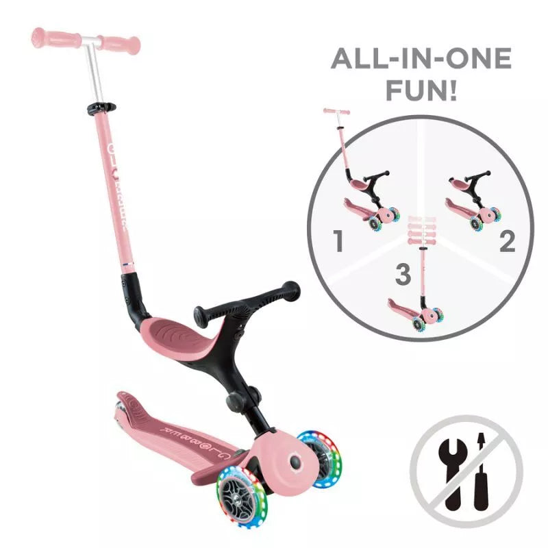Naudodami patentuotą sulankstymo sistemą, lengvai sulankstykite šį triratį paspirtuką į vežimėlio režimą, kad galėtumėte jį nešiotis arba vežti po dienos pasivažinėjimų.