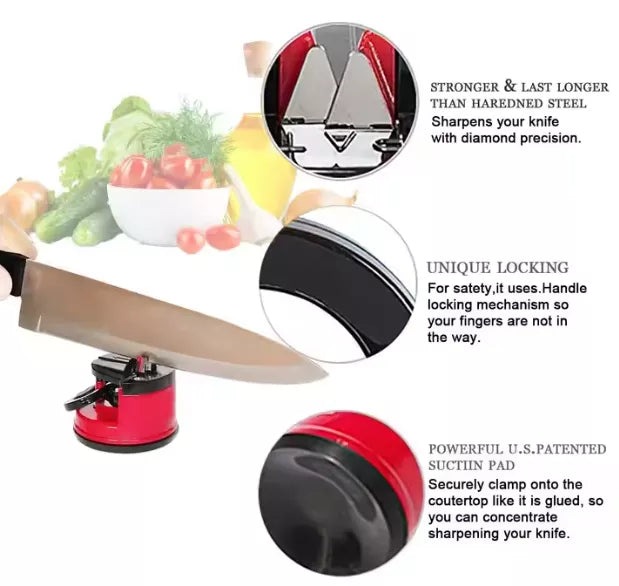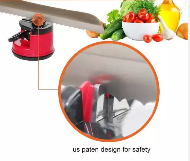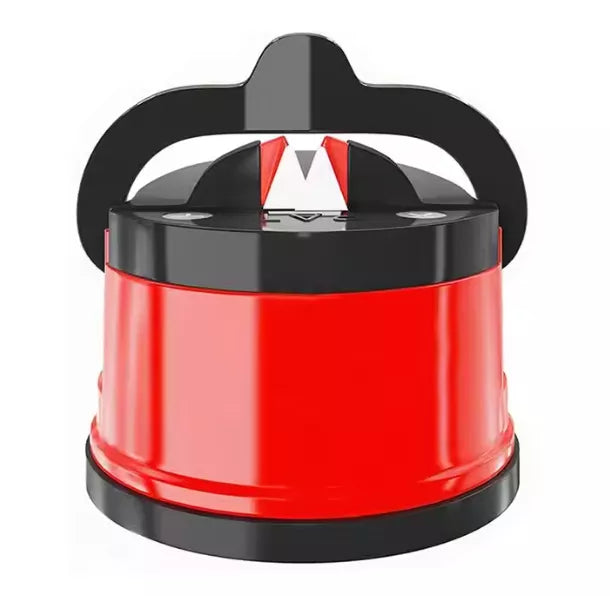 Ergonomiška rankena leidžia lengvai užrakinti prietaisą ant lygaus paviršiaus. Norėdami pradėti galandimą, tiesiog paspauskite svirtį, kuri įjungia prisiurbimo taurę, ir kelis kartus patraukite ašmenis rodyklės nurodyta kryptimi. Tai greitas, saugus ir efektyvus būdas išlaikyti jūsų įrankius puikios būklės.