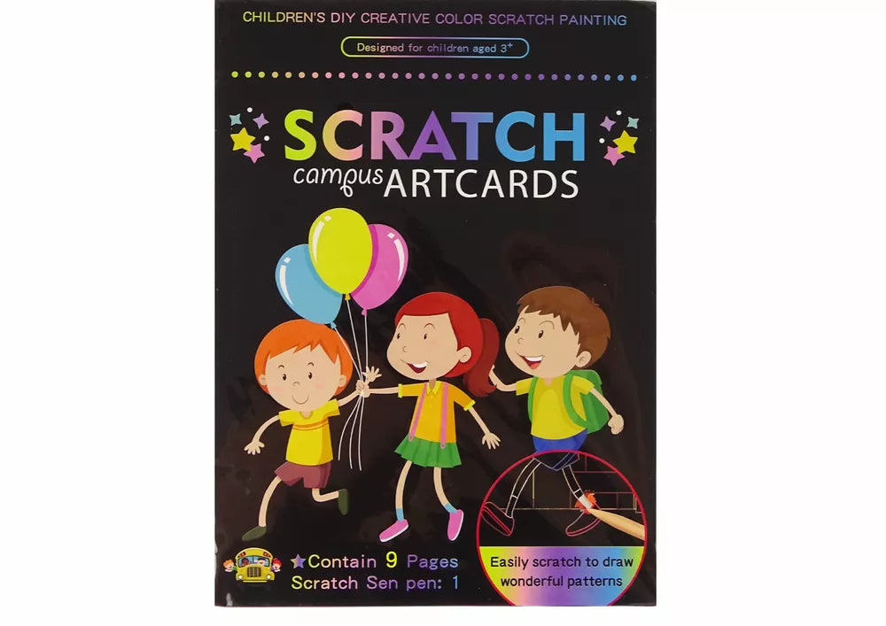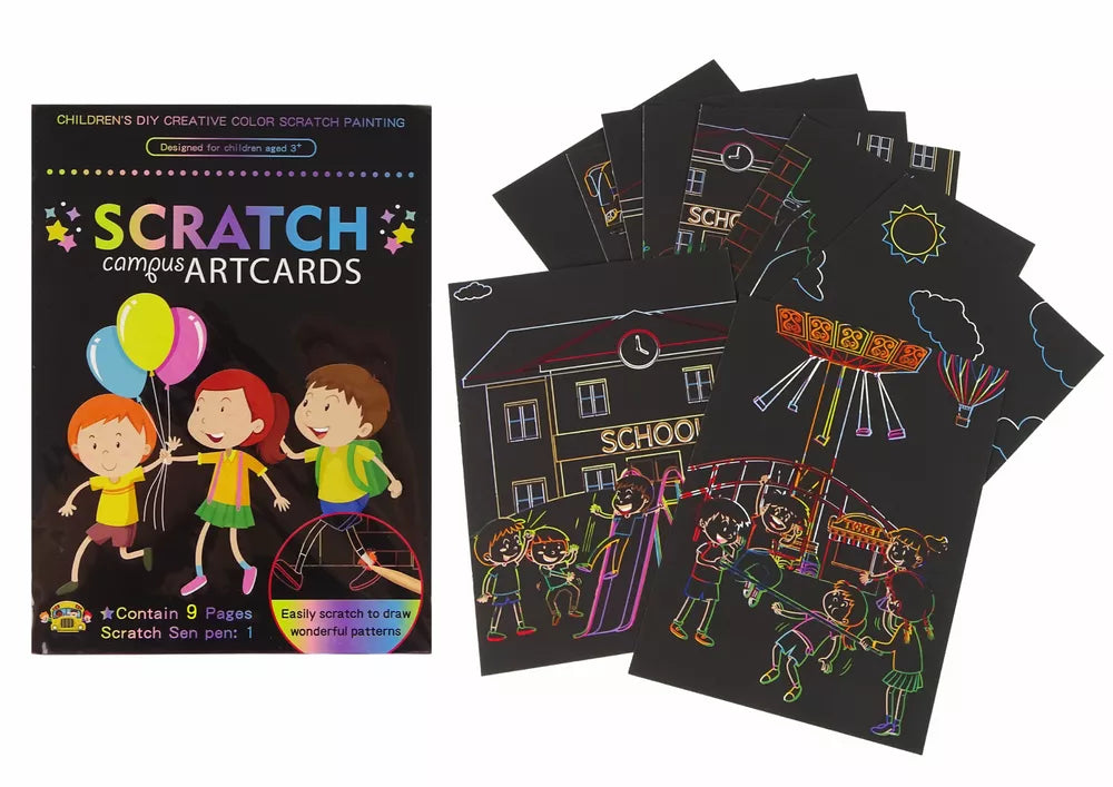 Rinkinyje rasite 9 paveikslėlius braižymui, kurie atgyja prieš vaiko akis. Smagu ir paprasta: specialiu mediniu pagaliuku galima nubraukti juodą sluoksnį nuo paveikslėlio ir atskleisti gražias ir spalvingas iliustracijas. Šiose iliustracijose vaizduojamos įvairios mokyklinės veiklos ir žaidimai, todėl žaidimas yra ir edukacinis, ir įtraukiantis.