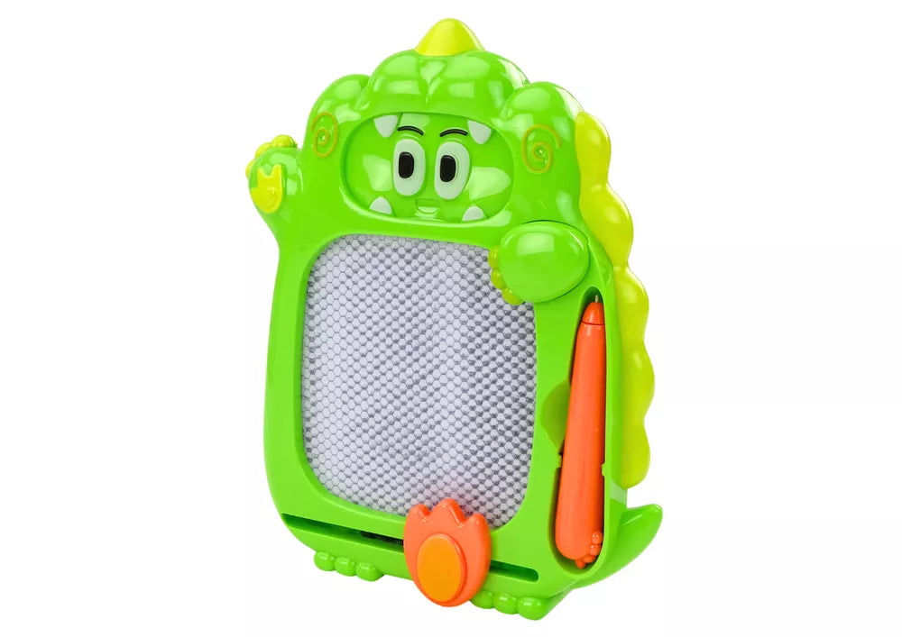 Dvipusė lenta žaidimas žalio dinozauro formos yra puikus žaislas, apjungiantis kūrybiškumą su arkadiniu smagumu. Viena vertus, lenta naudojama piešimui ir veikia markerio principu. Rinkinį sudaro specialus rašiklis, su kuriuo mažylis gali piešti įvairius raštus ir figūras. Kai jūsų piešinys bus paruoštas, tiesiog pastumkite slankiklį lentos apačioje, kad visiškai jį ištrintumėte ir vėl pradėtumėte kurti. Ši funkcija leidžia vaikams neribotai kurti ir lavinti meninius įgūdžius nenaudojant popieriaus ir kreidelių.