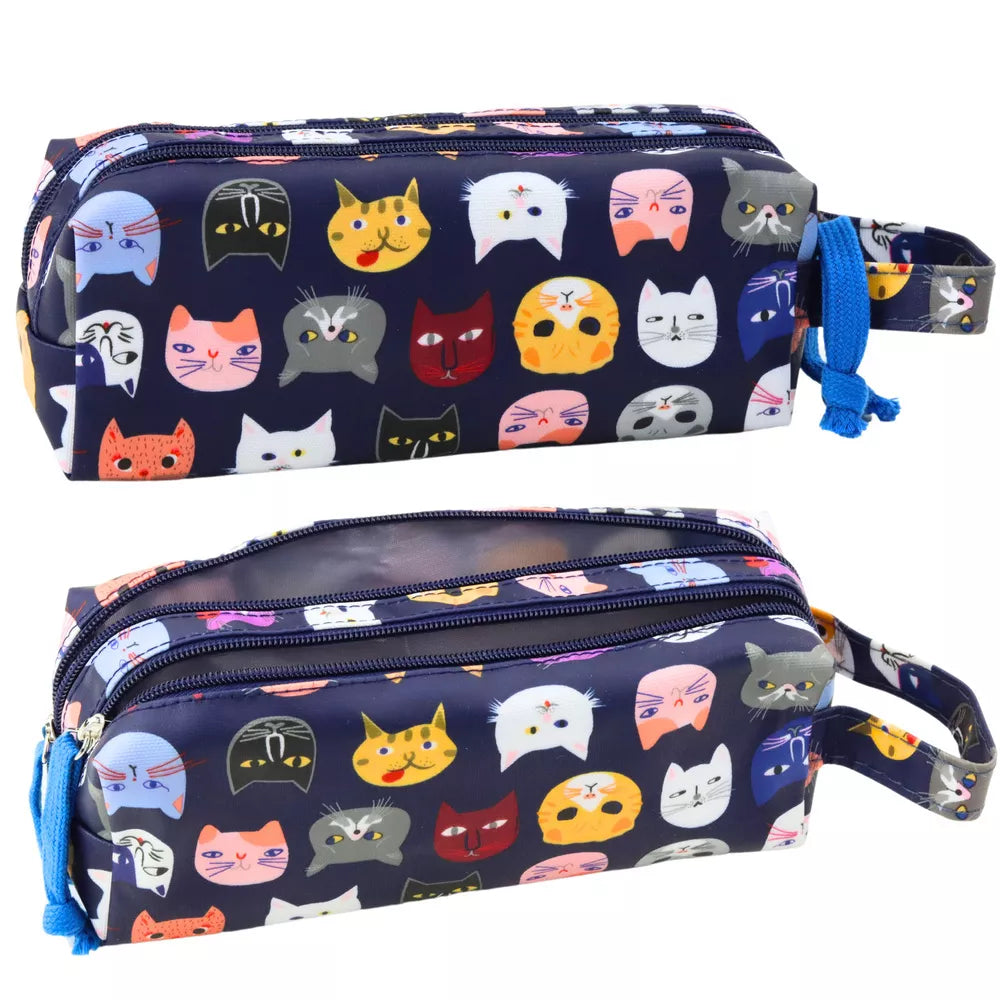 Pieštukinė mokyklinė penalinė Spalvingi katės Du skyriai Tamsiai mėlyna 22cm