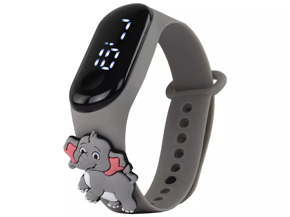 Žavus laikrodis su jutikliniu ekranu ir dramblio motyvu ant pilko dirželio. Šis modernus laikrodis sukurtas atsižvelgiant į jauniausius vartotojus, derinant funkcionalumą su smagiu ir spalvingu stiliumi.